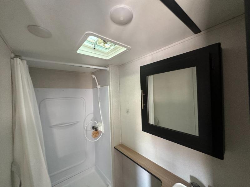 This double axle trailer offers lots of sleeping space for your family and friends with the double-size bunk beds, the queen bed and the booth dinette. Once everyone selects their sleeping space, you can take turns getting cleaned up in the full bathroom with extra counter space for everyone's toiletries. The cook can whip up a snack before bedtime on the two burner cooktop or grab something from the 6 cu. ft. refrigerator and the pantry. There is a closet up front, overhead storage throughout, and inside storage under the bunk for everyone's things. And the exterior provides a pass-through compartment for more items and the outdoor gear like fishing poles and camping chairs.