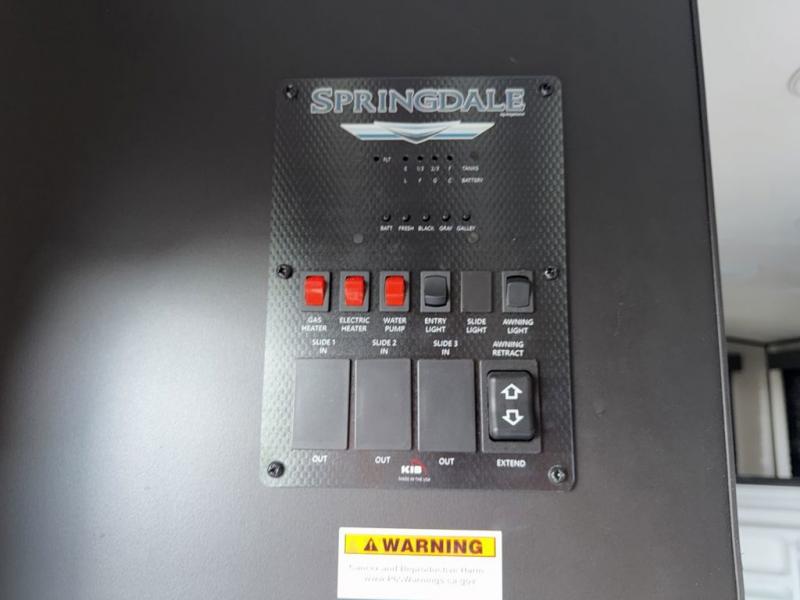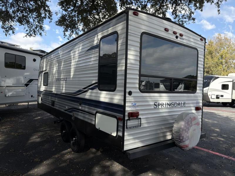 Check out this accommodating Springdale by Keystone! This trailer features a comfortable walk-around queen bed in the front with plenty of wardrobe space and a privacy curtain for you to dress for any occasion. Meal time can be memory time when you enjoy your meals at the U-shaped dinette with everyone which can also be transformed into an extra sleeping space for two at night, and the entertainment center is going to be a fun feature for movie night if you add the optional TV! There is also an exterior pass-through storage for you to easily access and keep your camping gear or other necessities.