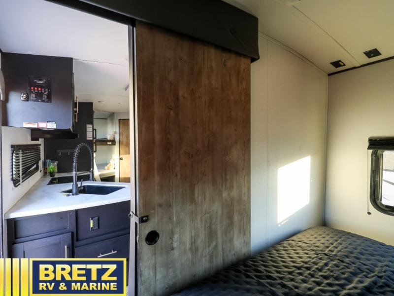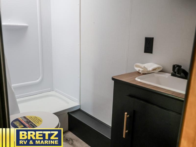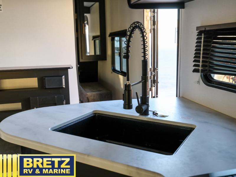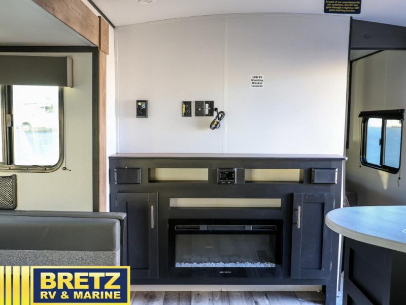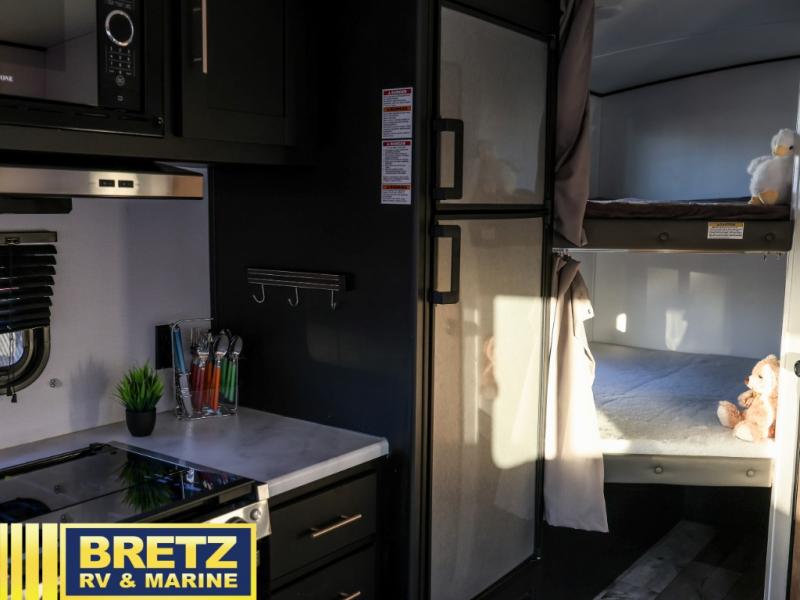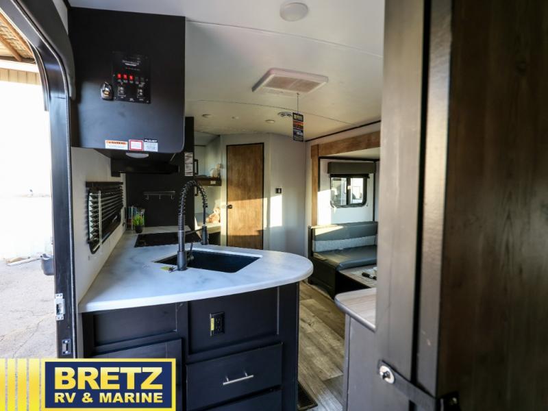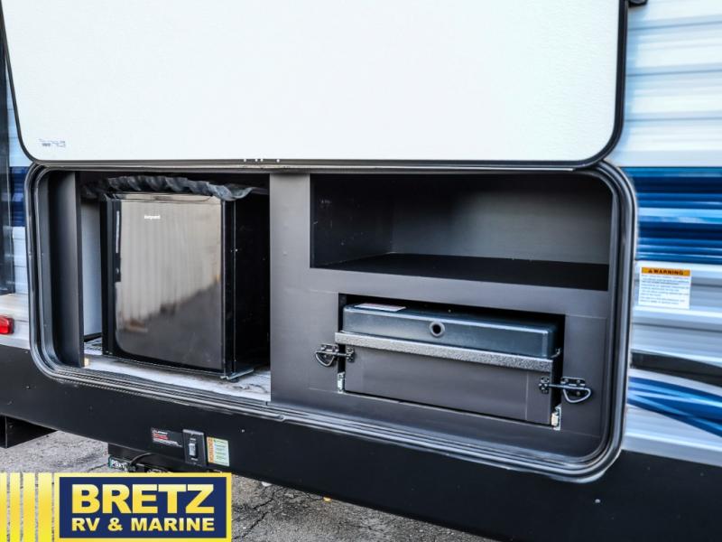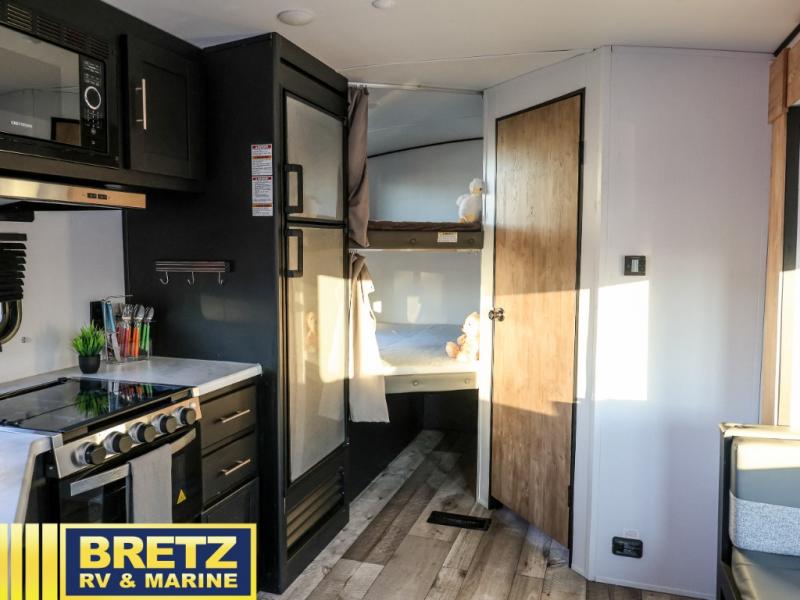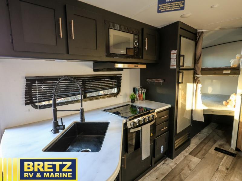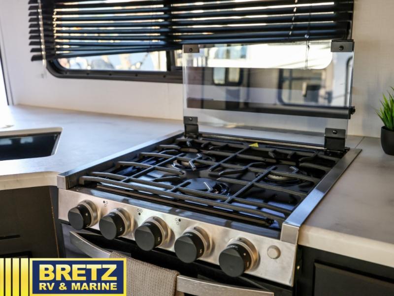 Whether you enjoy camping with your companion or a larger group, you will have plenty of space to call your own and to offer sleeping space for friends and family. There is a private front bedroom with a queen bed and storage for you, a U-shaped dinette slide for eating meals at and sleeping at night when needed, as well as a set of double-size bunks in the rear giving you sleeping space for a total of eight. Outside, you can make meals using the outdoor kitchen, relax under the 18' power awning, and store your camping gear in the pass-through compartment. If you need a little bit more help to create dinner, you can head back inside where you will find a three-burner range with glass top and more in the full interior kitchen.