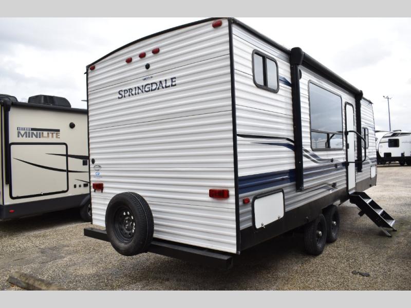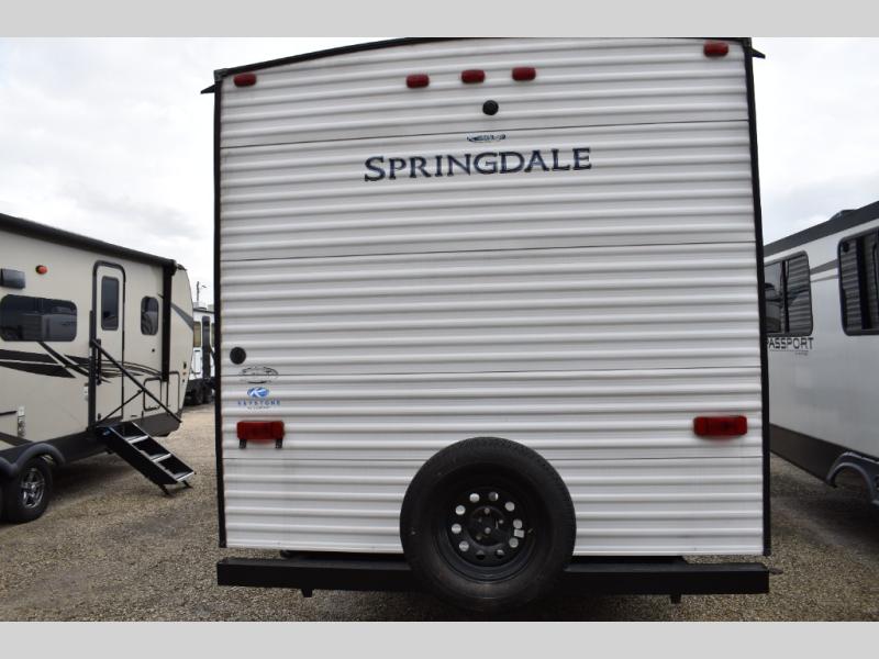 With any Keystone Springdale travel trailer, you will have a friction hinge entry door with sturdy LCI SolidStep steps, a pass-through storage compartment for your outdoor gear, and reliable Dexter E-Z Lube axles to maneuver your Springdale down the road and into the campsites. Some of the Keystone Exclusives provide 12V color-coded wiring with easy-to-trace circuits which is better than conventional RV wiring allowing a faster diagnosis for quicker repairs, and the streamlined heat distribution that uses in-floor heat vents for more efficiency for uninterrupted air flow. Also included, the Blade high performance air flow system that delivers 30% more air flow. The interior gives you pressed kitchen countertops, pleated night shades, and designer upholstered window valances for easy care and style, and more depending on the Springdale you choose!