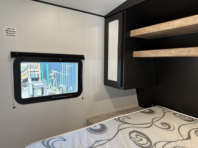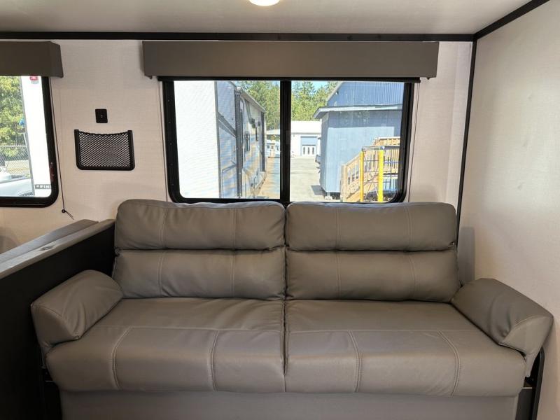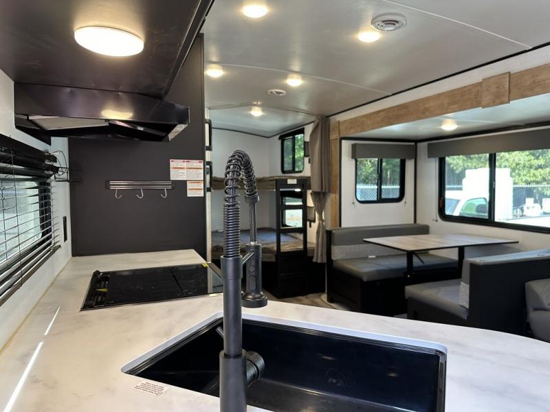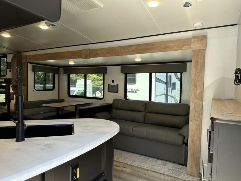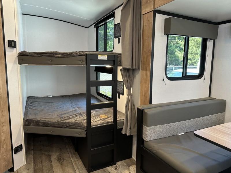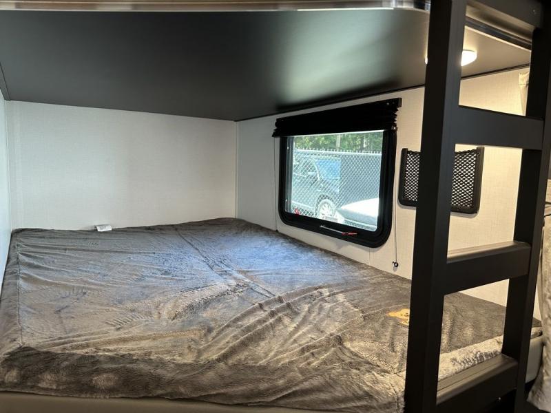 For the larger group, this Springdale is the perfect travel trailer because it features a set of double-size bunks, two entry doors, a large slide out, and sleeping for nine people. Step inside using the main entry and see just how spacious the combined kitchen and living area are. For a quiet retreat, enjoy the front bedroom where you can expect to get a great night's rest. The back of this trailer contains a set of double-size bunks that the kids or your friends will surely love. Or, you can easily take along extra guests. There is a convenient ladder to access the top bunk, and you will also enjoy the front exterior pass-through storage compartment for all of your outdoor camping gear.
