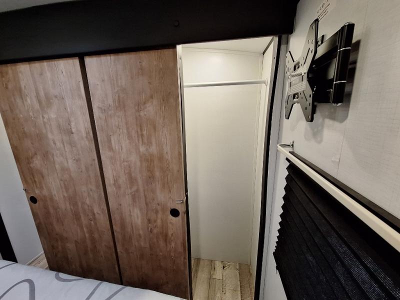 The rear kitchen in this Springdale travel trailer is great because of the U-shaped countertop which gives you plenty of room for prepping your meals and cleaning up as well as all the appliances and the pantry. There are a few seating choices throughout where you can relax, play games, or eat meals, like the two recliners with a table in between to place your drinks and keys, the sofa, and the booth dinette. The private master bedroom up front has a queen bed which is perfect for a good night's rest, and storage on each side plus above the head of the bed.