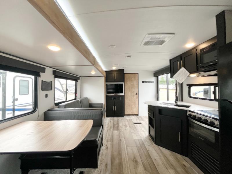 With any Keystone Springdale destination trailer, you will have a fully walkable roof with seamless one-piece TPO roof membrane, a one-piece polypropylene, heated and enclosed underbelly, plus rack and pinion slide mechanism and safety glass functional windows in the slide outs. Some of the Keystone Exclusives provide 12V color-coded wiring with easy-to-trace circuits which is better than conventional RV wiring allowing a faster diagnosis for quicker repairs, and the streamlined heat distribution that uses in-floor heat vents for more efficiency for uninterrupted air flow. Also included, the Blade high performance air flow system that delivers 30% more air flow. The interior gives you a 6'10" vaulted ceiling, designer upholstered window valances, a decorative light over the dinette, pressed kitchen countertops and so much more depending on the Springdale you choose!