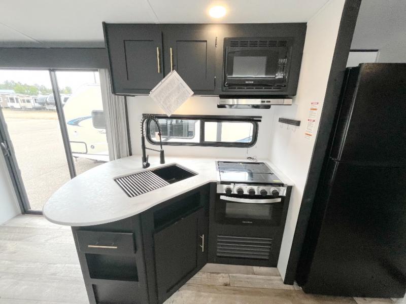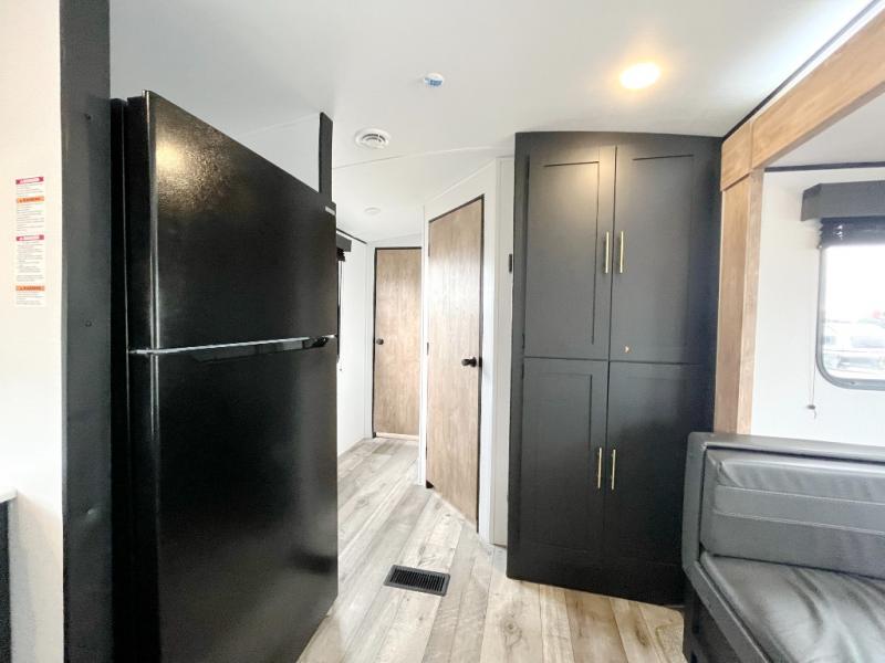 This spacious Keystone Springdale destination trailer offers a larger family or group of friends many comforts of home with sleeping for nine found between the bedding and furniture! Your kids or friends will love the front bunkhouse with triple bunks and a kids dinette, and everyone will appreciate the double slides for added space, plus the double entry doors to promote a smooth flow of traffic in and out the main living area and the rear bedroom. And the kitchen offers all that you need to prepare and cook for your hungry crew while camping. There is a large kitchen sink making clean-up easy, a three-burner range for cooking, a residential refrigerator for lots of perishable items, and two pantries for dry and canned good storage.