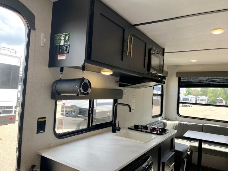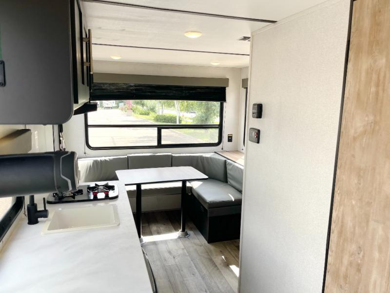 You will find lots of storage inside and outside this trailer allowing you to bring along everything you need for a great camping trip! Along the exterior there are two pass-through compartments for your outdoor gear and a 10' power awning giving you a covered outdoor living area to enjoy when you aren't inside. The cook will have a two burner cooktop to make meals, and the U-shaped dinette offers great views out of the panoramic windows. There is a full bathroom to get cleaned up in before bedtime, and a queen bed to fall asleep quickly so you can have fun again tomorrow.