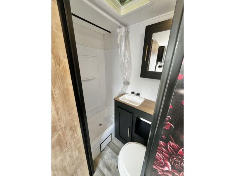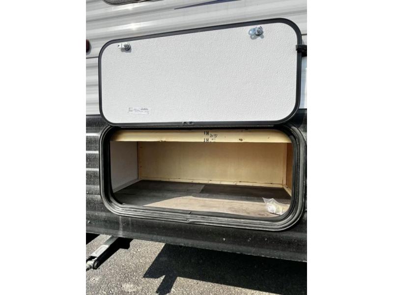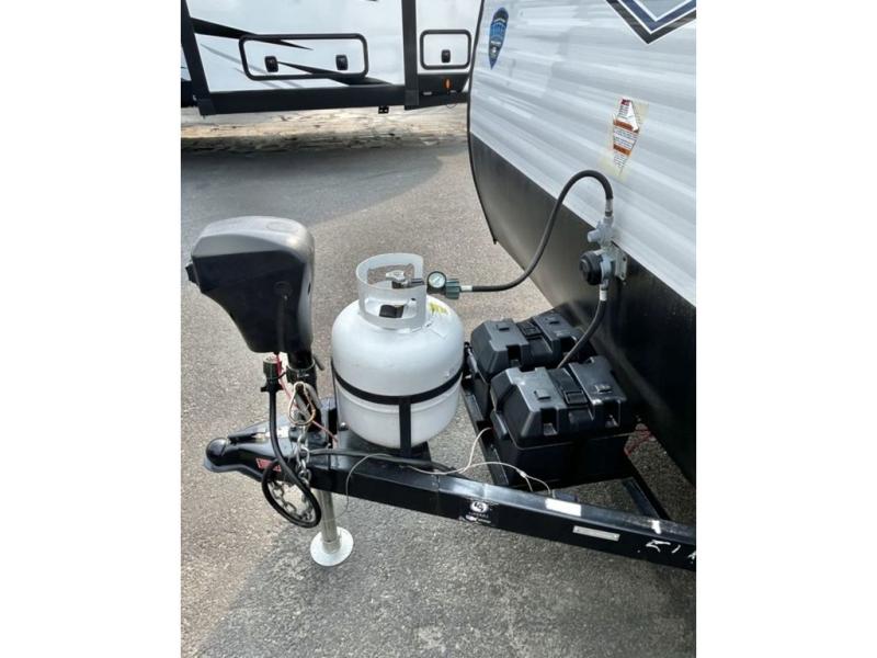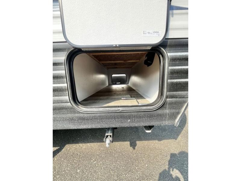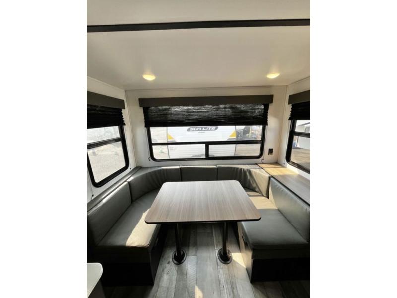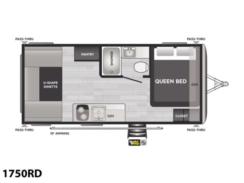You will find lots of storage inside and outside this trailer allowing you to bring along everything you need for a great camping trip! Along the exterior there are two pass-through compartments for your outdoor gear and a 10' power awning giving you a covered outdoor living area to enjoy when you aren't inside. The cook will have a two burner cooktop to make meals, and the U-shaped dinette offers great views out of the panoramic windows. There is a full bathroom to get cleaned up in before bedtime, and a queen bed to fall asleep quickly so you can have fun again tomorrow.