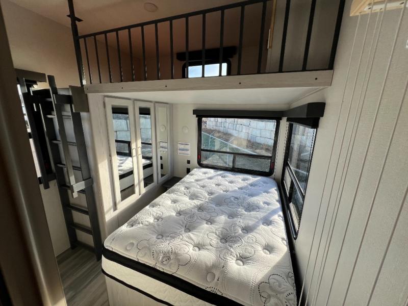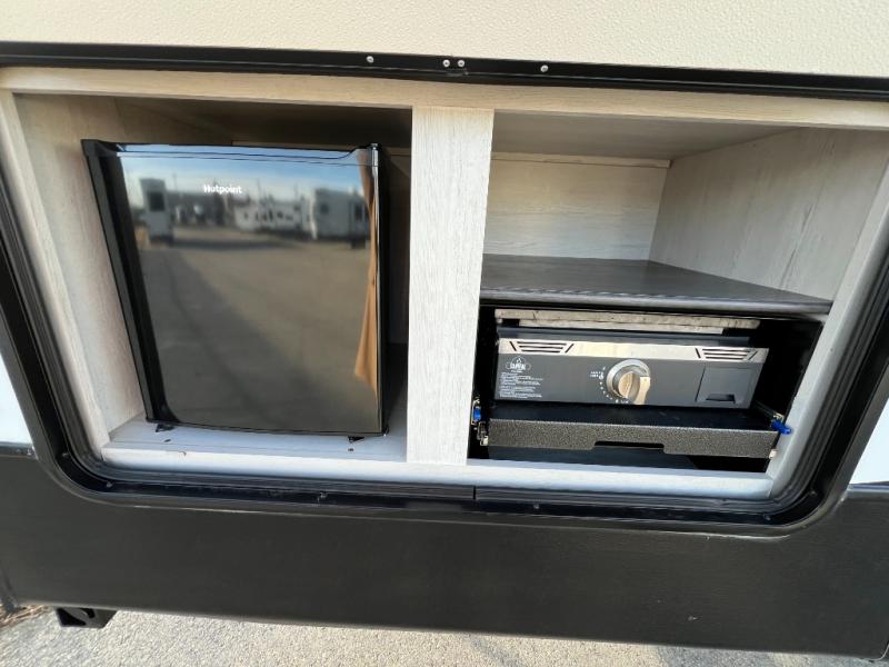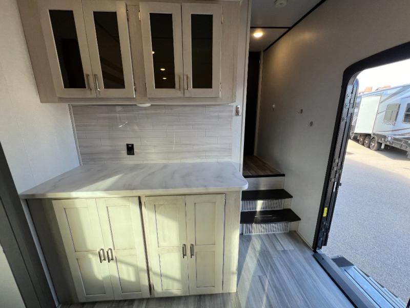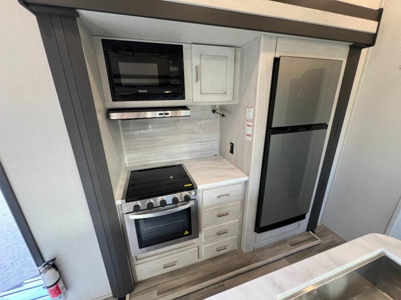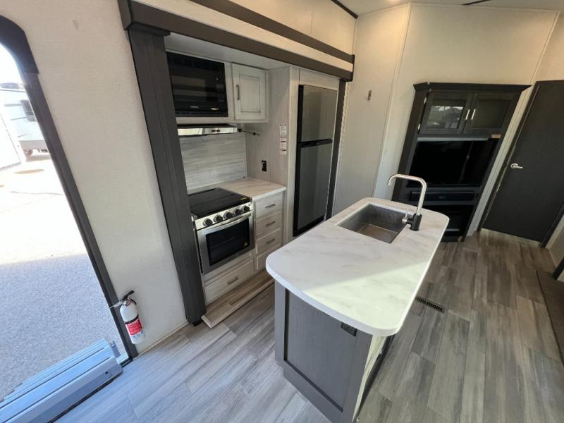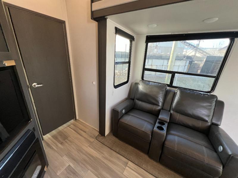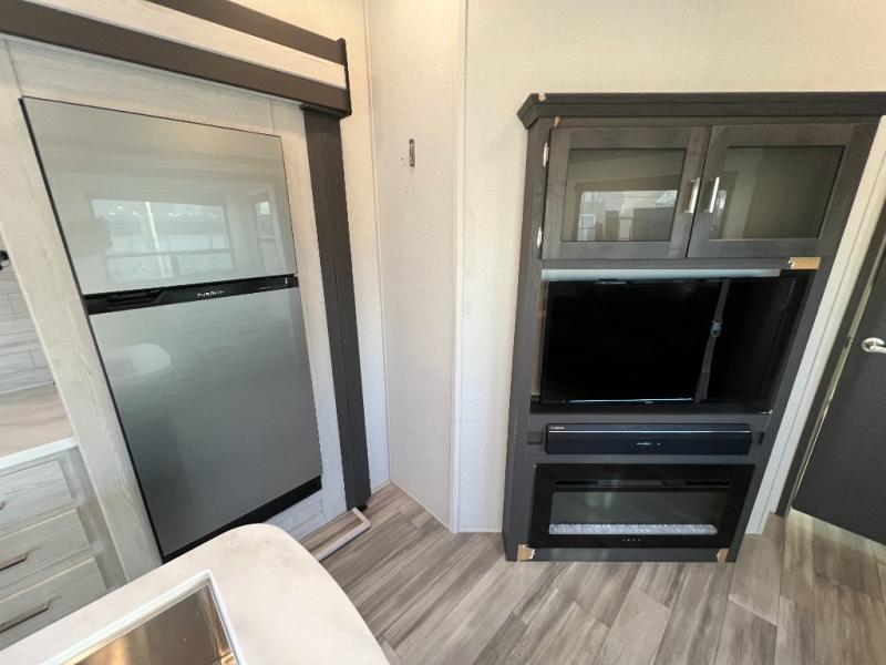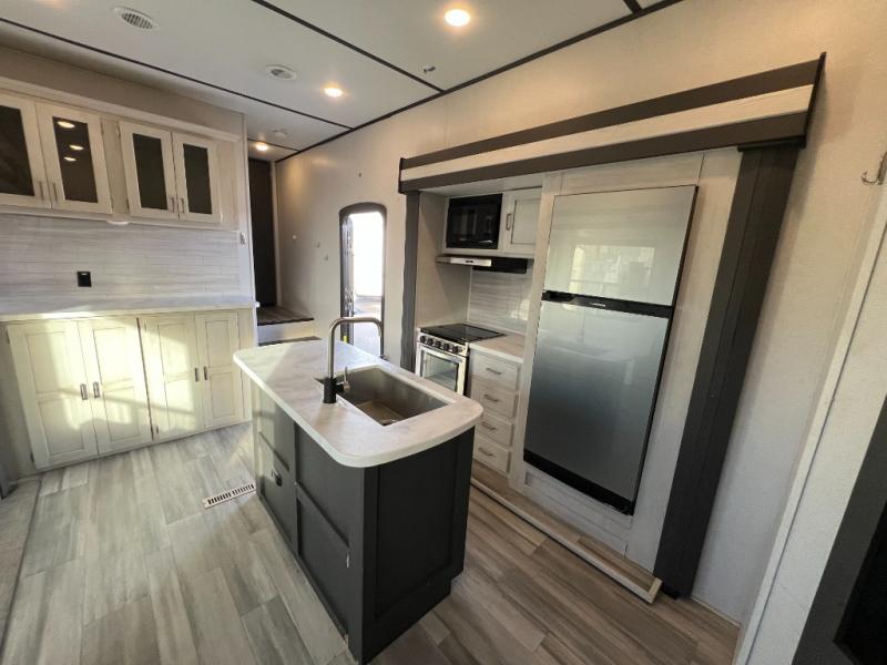 When you want a spacious fifth wheel with so many features you can't choose your favorite, this is the one! From having dual entry for easy access inside and outside especially when you have friends join you, to having full kitchen amenities such as a three-burner gas range with stainless steel oven, a microwave with carousel and an 8 cu. ft. refrigerator with the option to upgrade to a 10 cu. ft.. There is an additional prep area and the kitchen island includes a deep single-basin stainless steel industrial sink with high-rise faucet making cleaning up a breeze. The full reclining theatre seating and booth dinette offer a place to unwind while watching the 40" LED HD TV with fireplace/heater below. And the 54" x 74" loft with ladder over the 54" x 74" bed plus the half bath with interior and exterior entry is icing on the cake. You will find many more features inside you will love, and outside to enjoy such as the two mini refrigerators for more beverages, the central hookup station with hot and cold water hookup, the XL pass-through storage, and more!