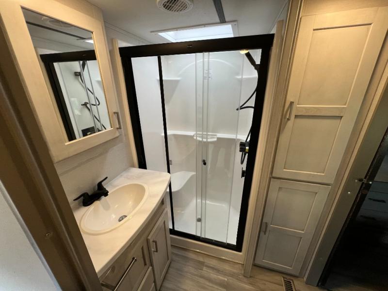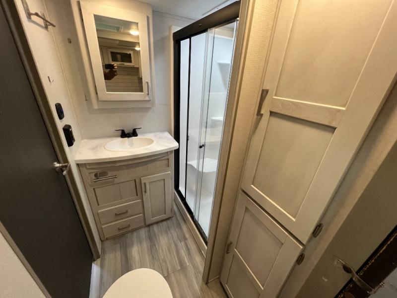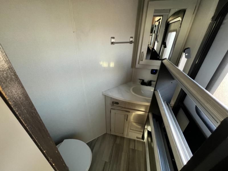 With any Sprinter fifth wheel by Keystone RV, you will have elements of a traditional RV lifestyle, Camping Made Easy features, and more living space, storage and towing stability in this longest-standing brand! The exterior includes a 100" wide-body frame with full width outriggers, MaxTurn technology with Road Armor suspension, Hitch Vision, an automotive-grade painted fiberglass front cap with KeyShield protection, plus the Thermal package and a heated and enclosed underbelly with astro-foil insulation for all-weather camping. There is a wireless remote control for slideouts, lights, awning and more, Thomas Payne theatre seating with USB, lights and massage, plus woven flooring that is highly durable marine-grade flooring for easy cleanup after a fun trip. Make your selection today!