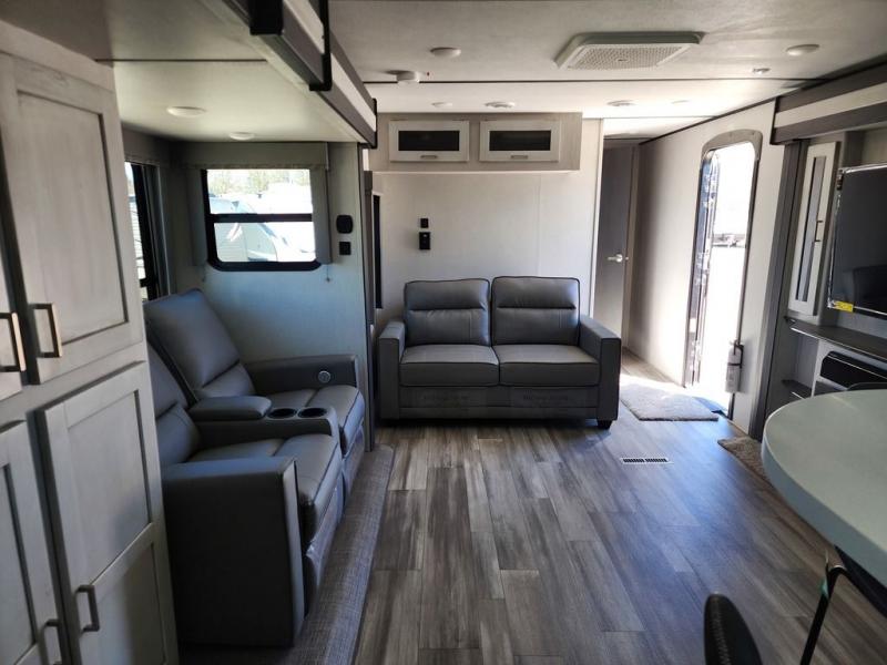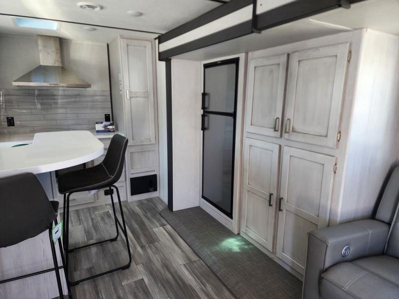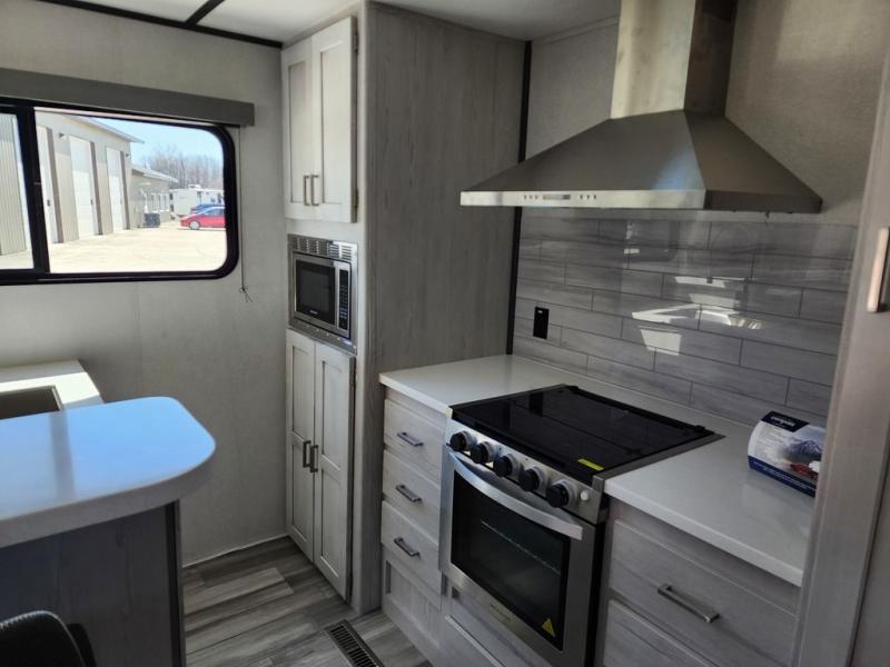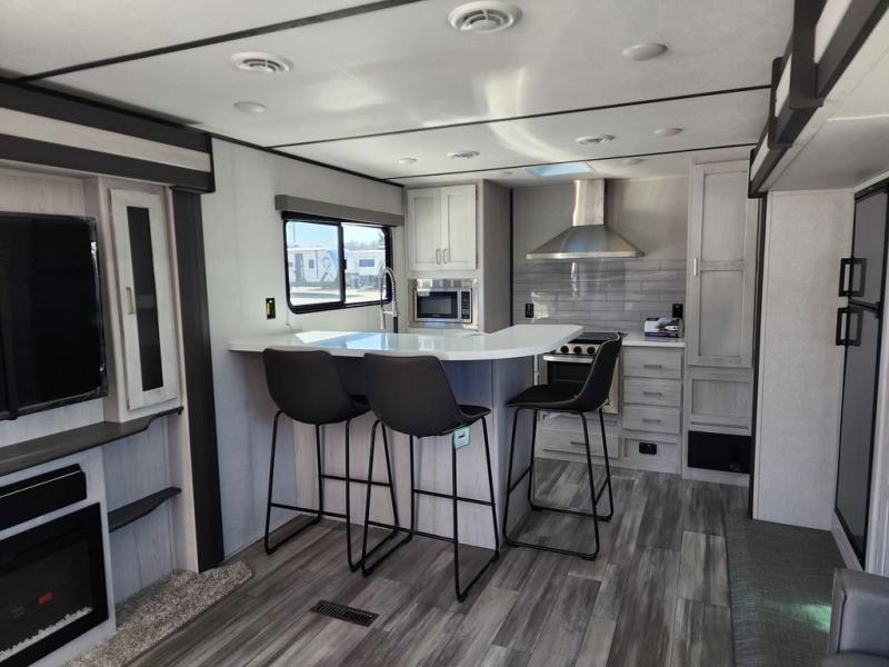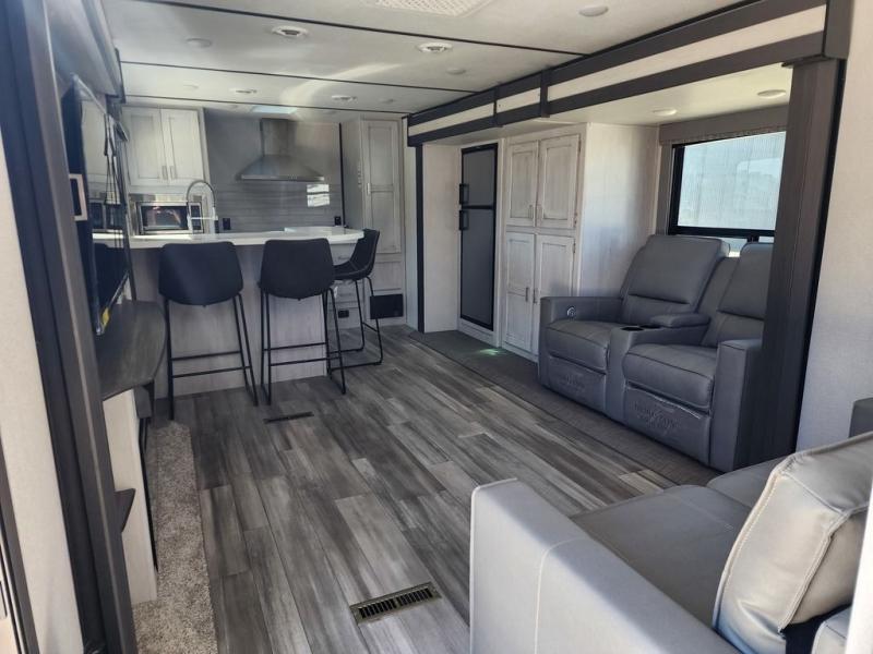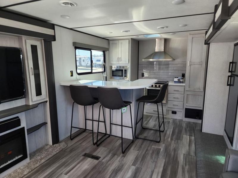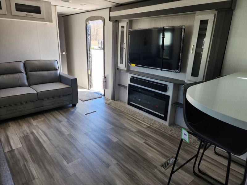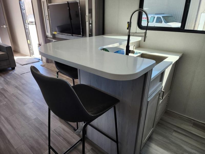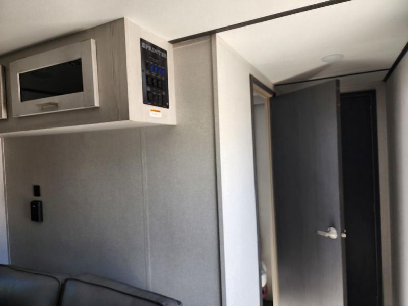 This Sprinter Limited travel trailer is an exceptional unit that you can take to that summer beachside or wooded fall retreat! You'll love using the breakfast bar with three stools every morning, and there is a USB outlet that you can use to charge your phones while you dig into your pancakes. The kitchen has an upscale vibe with its range hood above the range with glass top, and you'll love the extra warmth that comes from the fireplace. Spend Friday nights watching movies with the family on the 50" LED HDTV, and relax on the full-reclining theater seating with massage, lights, and USB. You'll also have a queen-size tri-fold sofa that you can relax on or sleep on later.