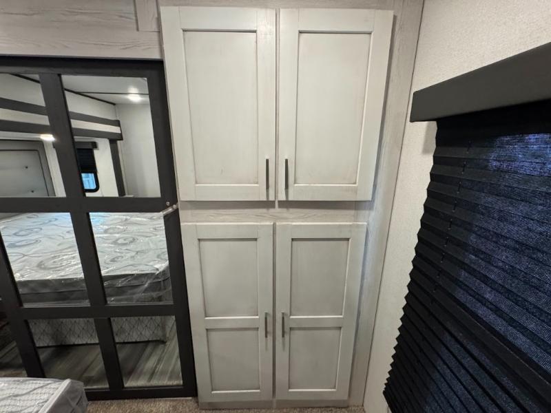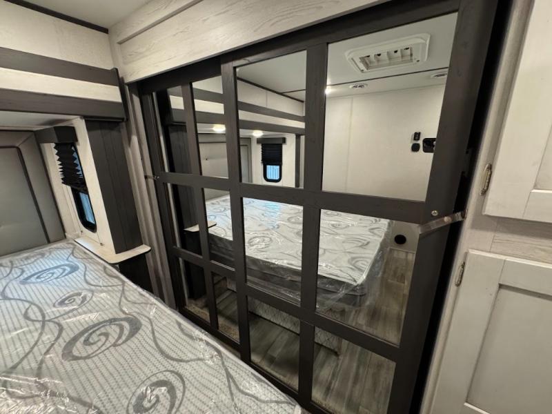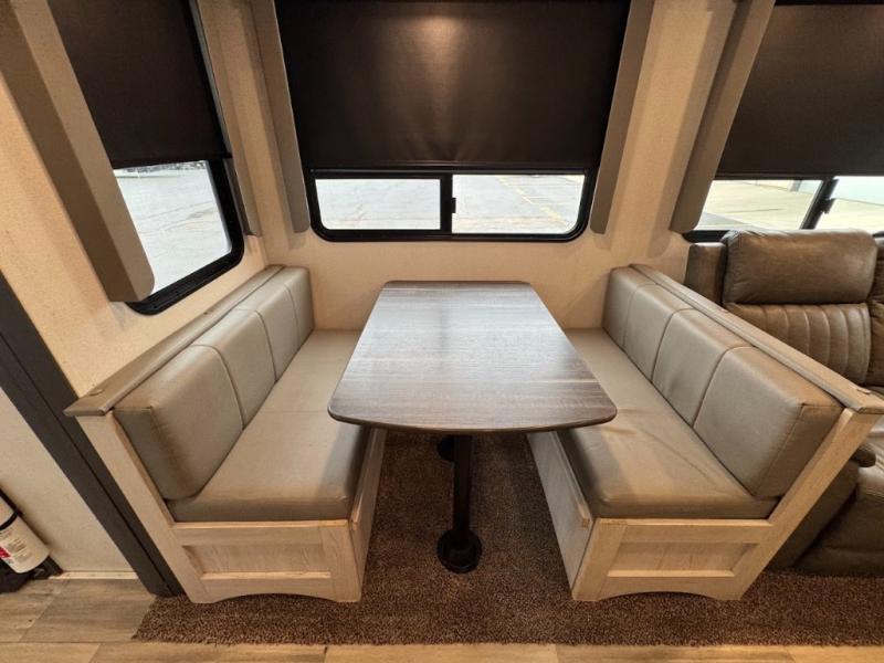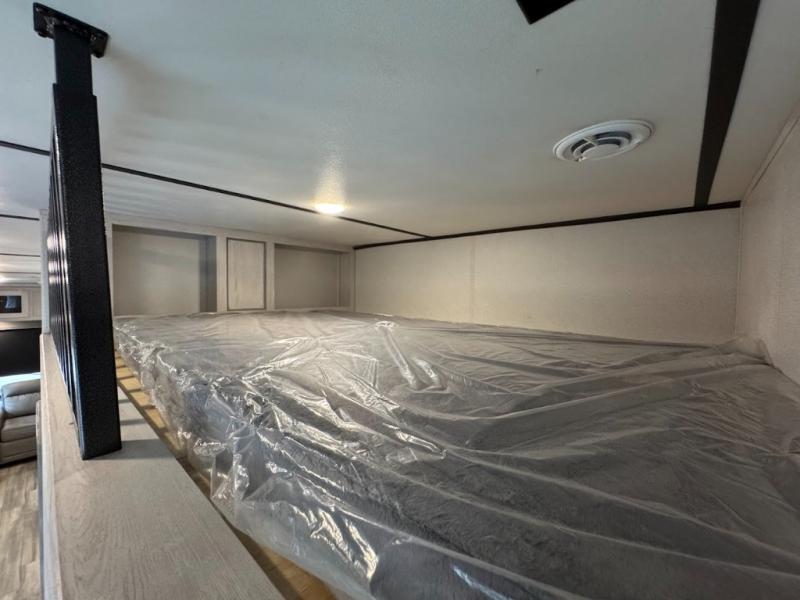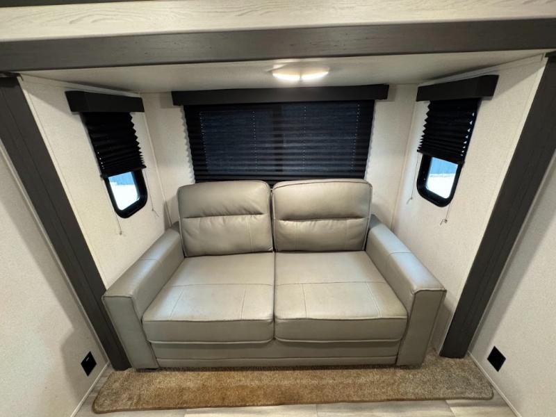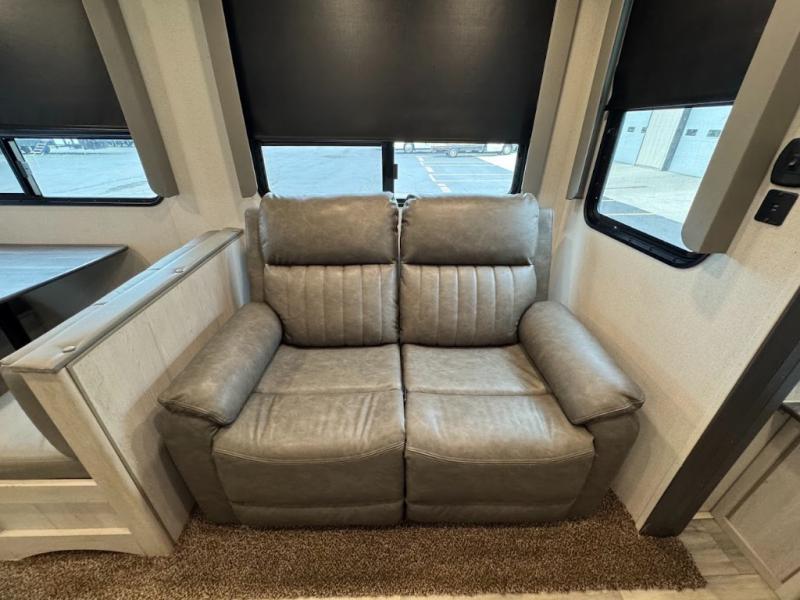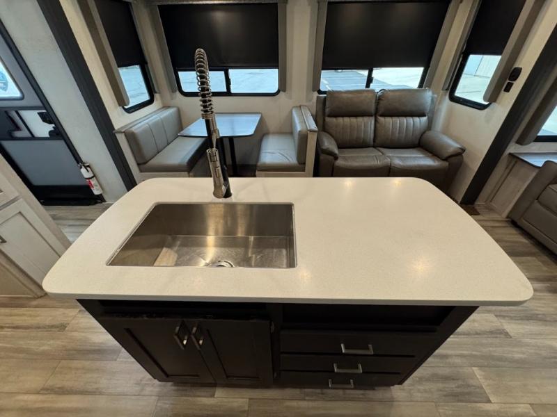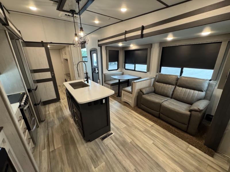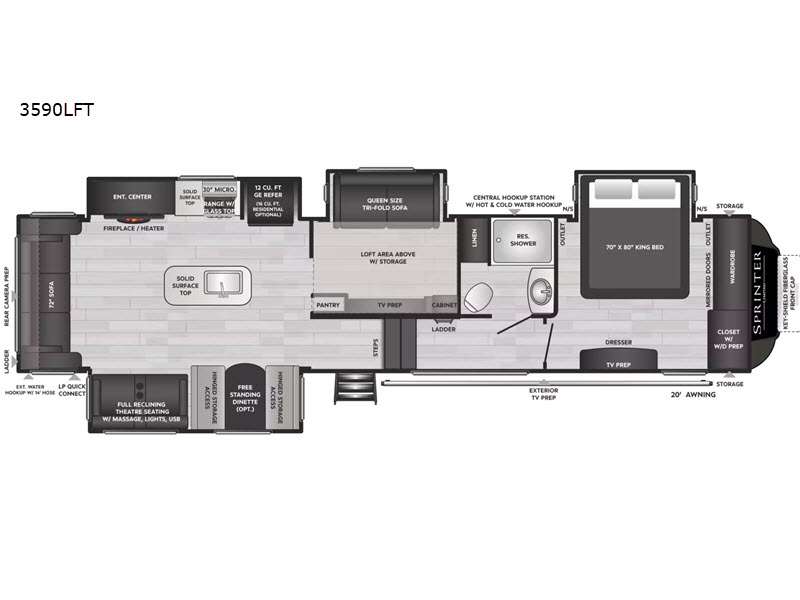 The main difference between this Sprinter Limited fifth wheel and model 3570LFT is that the slides in the living area are flip-flopped. This unit not only has a king-size bed up front in a private bedroom, but it also has a second bedroom with a queen-size tri-fold sofa. Above this second bedroom you'll also have more sleeping space in a loft with storage, and another tired camper can sleep on the 72" sofa out in the main living area. The kitchen offers you an island for more room while cooking and a pantry for your snacks. Sit down and eat a hot meal at the booth dinette with hinged storage access, and get even more comfortable on the full-reclining theater seating with massage, lights, and USB.