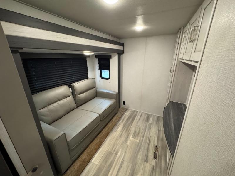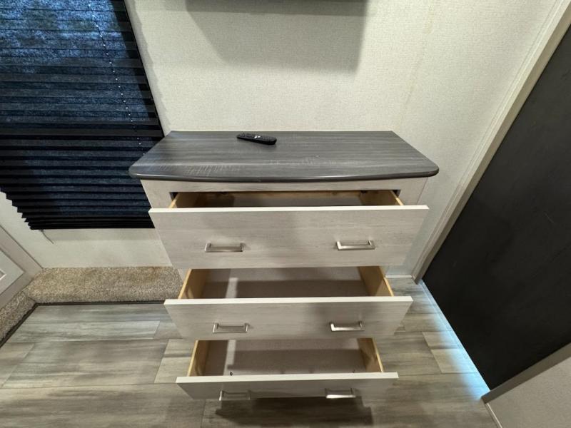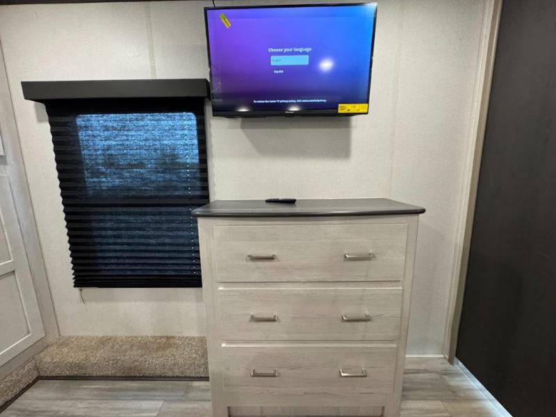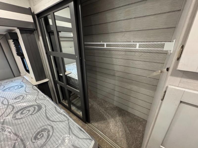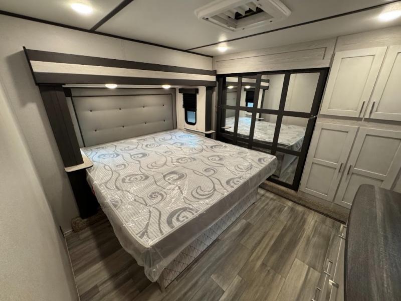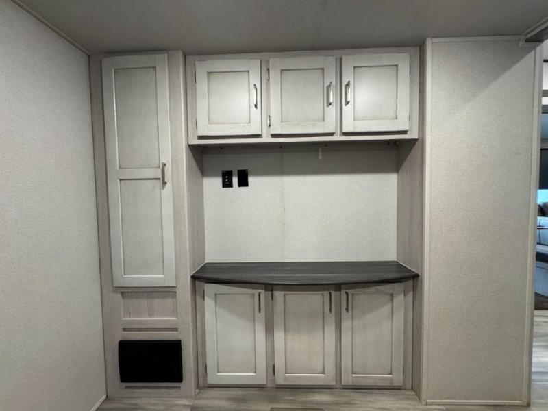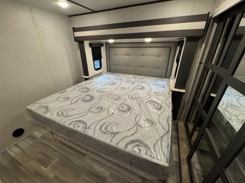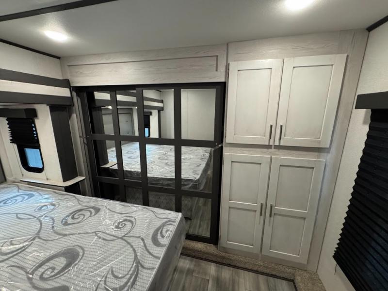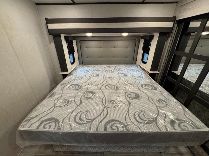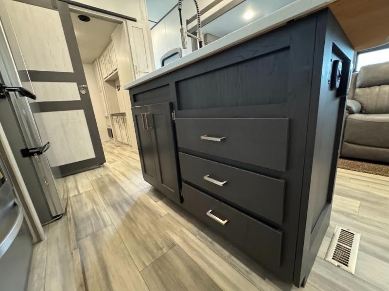 The main difference between this Sprinter Limited fifth wheel and model 3570LFT is that the slides in the living area are flip-flopped. This unit not only has a king-size bed up front in a private bedroom, but it also has a second bedroom with a queen-size tri-fold sofa. Above this second bedroom you'll also have more sleeping space in a loft with storage, and another tired camper can sleep on the 72" sofa out in the main living area. The kitchen offers you an island for more room while cooking and a pantry for your snacks. Sit down and eat a hot meal at the booth dinette with hinged storage access, and get even more comfortable on the full-reclining theater seating with massage, lights, and USB.