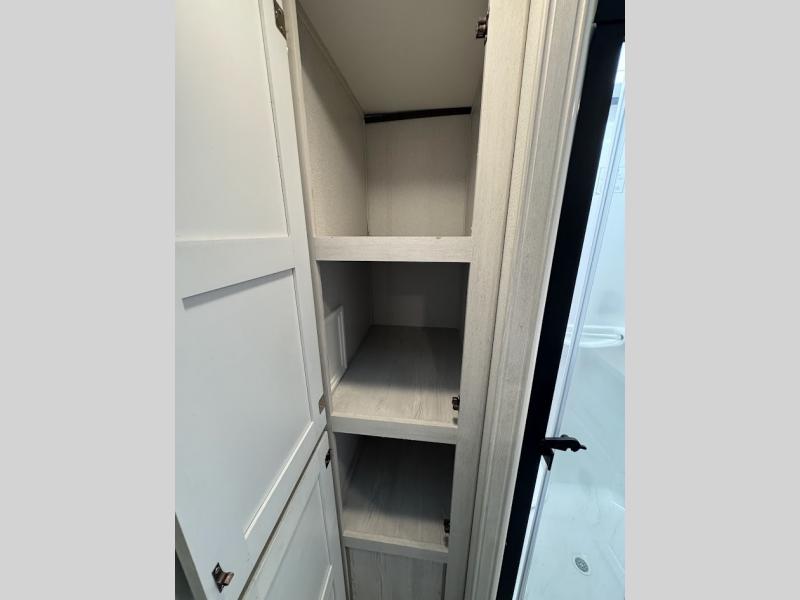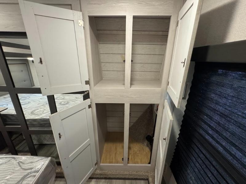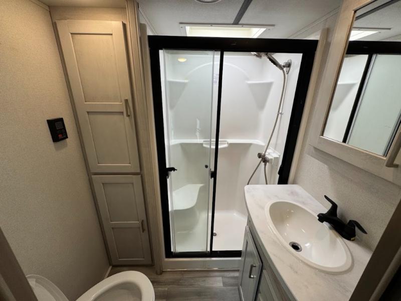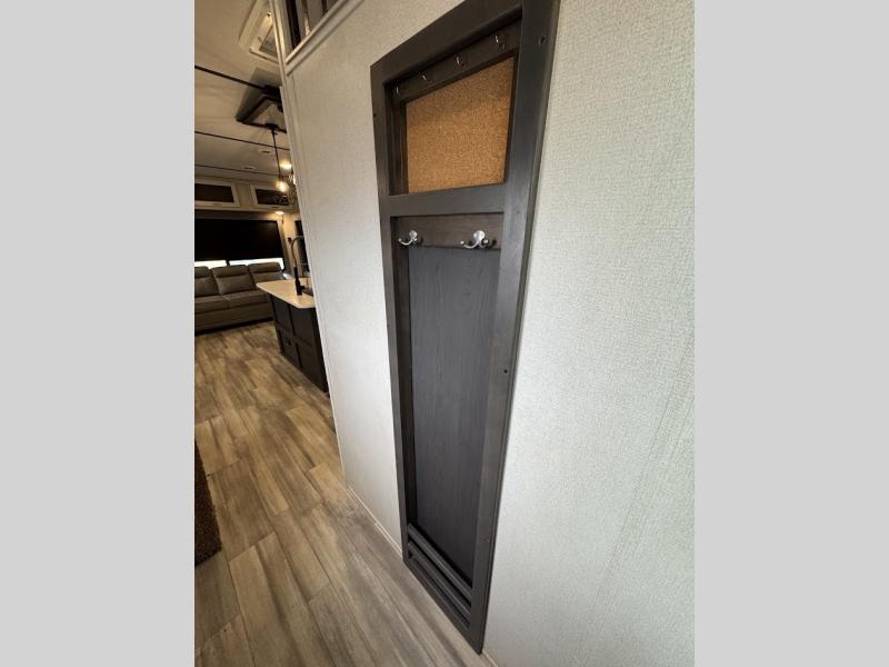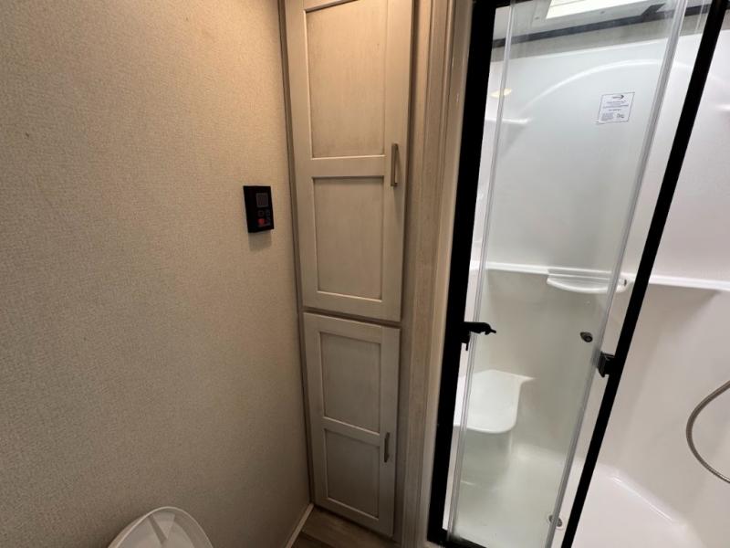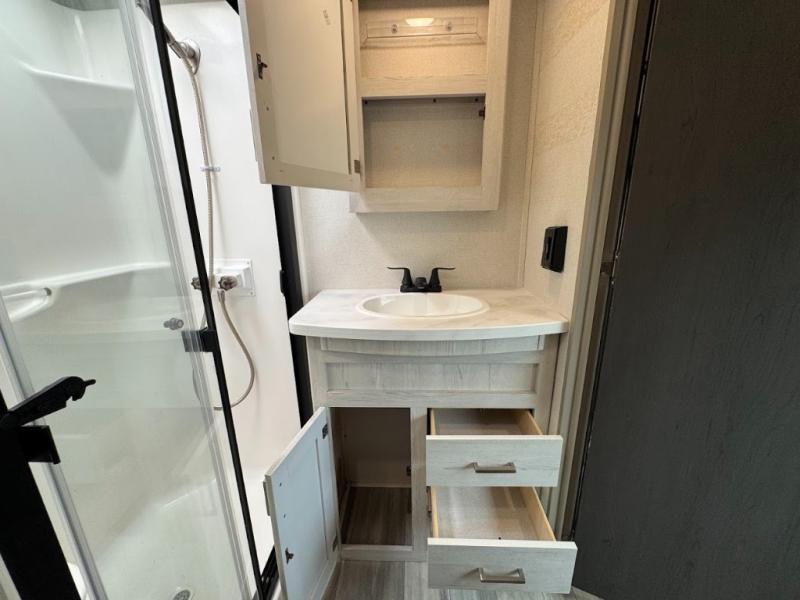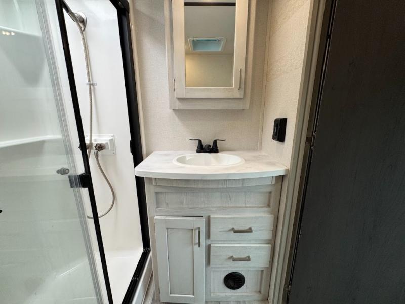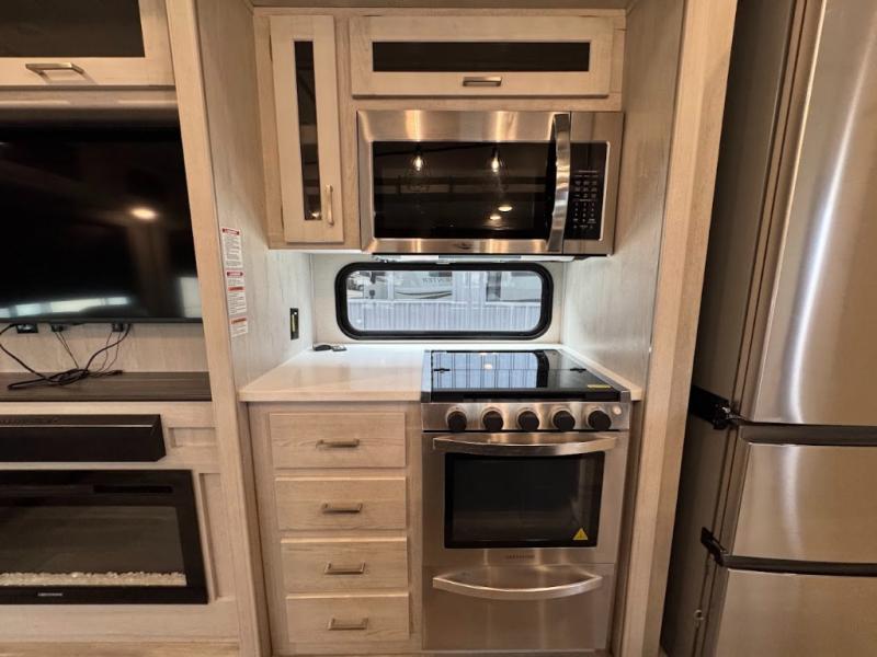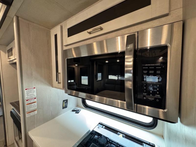 The main difference between this Sprinter Limited fifth wheel and model 3570LFT is that the slides in the living area are flip-flopped. This unit not only has a king-size bed up front in a private bedroom, but it also has a second bedroom with a queen-size tri-fold sofa. Above this second bedroom you'll also have more sleeping space in a loft with storage, and another tired camper can sleep on the 72" sofa out in the main living area. The kitchen offers you an island for more room while cooking and a pantry for your snacks. Sit down and eat a hot meal at the booth dinette with hinged storage access, and get even more comfortable on the full-reclining theater seating with massage, lights, and USB.