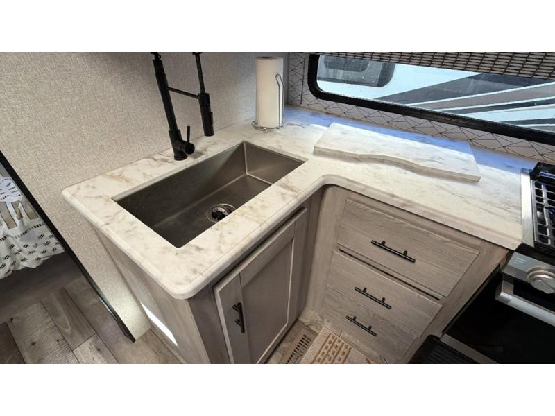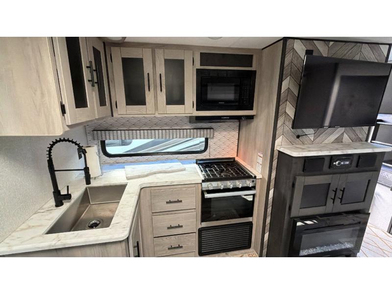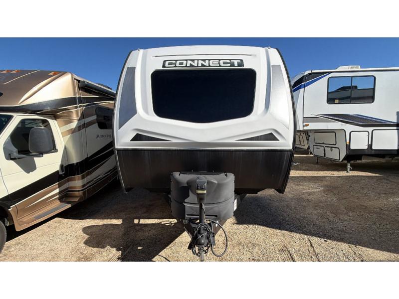 You will love spending your time in this Connect travel trailer because it has a U-shaped dinette directly across from the LED TV and 30" fireplace, so you can watch a show while you eat dinner. The kitchen is outfitted with a stainless steel microwave, residential faucet with spring sprayer, three-burner range with oven, and 8-cubic foot refrigerator, and there is also a kitchen skylight to give you more light to see what you're doing. Another skylight exists in the bathroom above the 30" x 36" shower, and the king-size bed in the front bedroom will deliver a very comfortable night of sleep. The more time you spend outside, the more you'll appreciate the 18' power awning with LED lights, and the exterior also has preparations for an outdoor entertainment center.