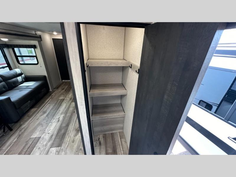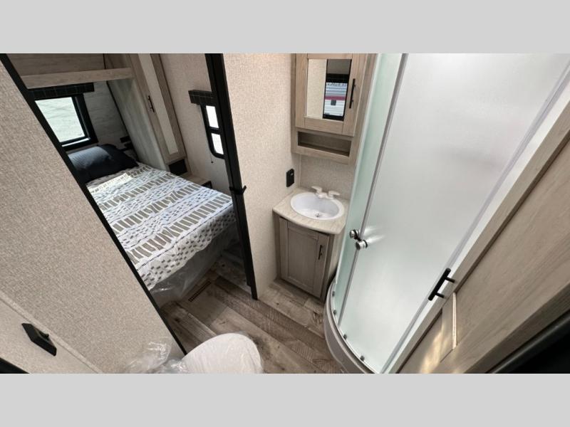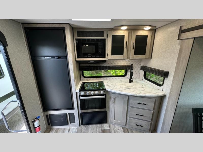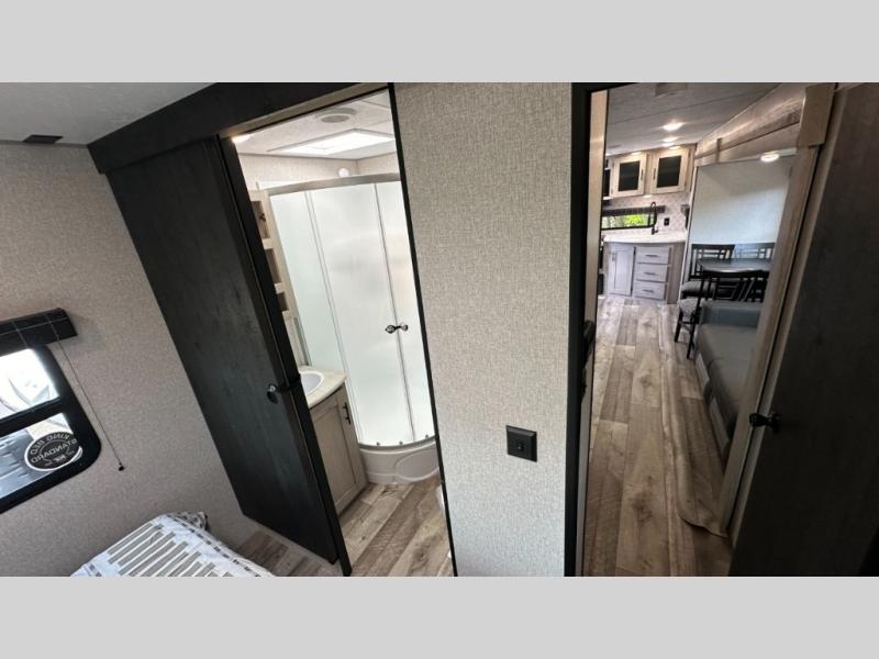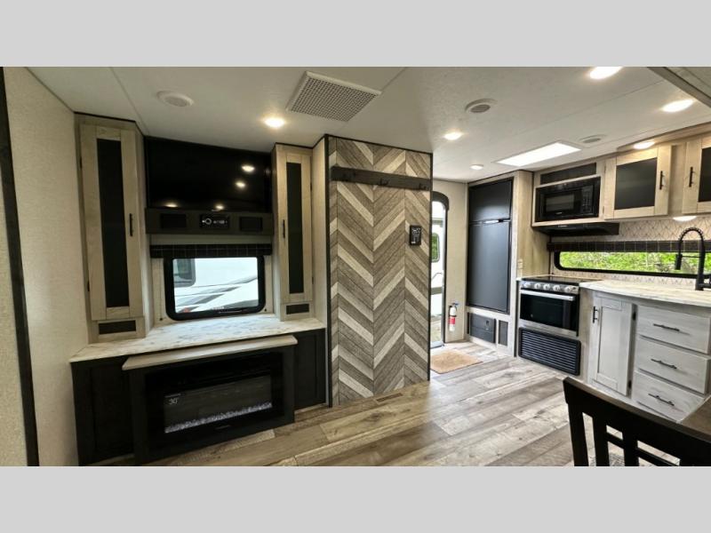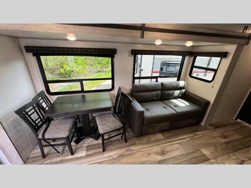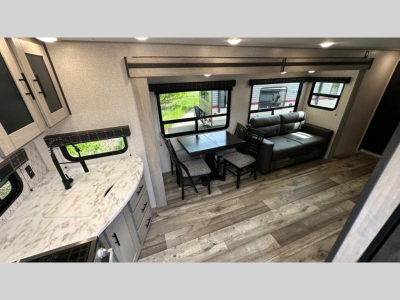 A: The 261RKK checks every box: 30'2" length, rear kitchen layout, power slide-out, Jiffy sofa sleeper, full bath, and solid galley—all under 7,000 lb dry. It balances roomy comfort with half-ton towability.