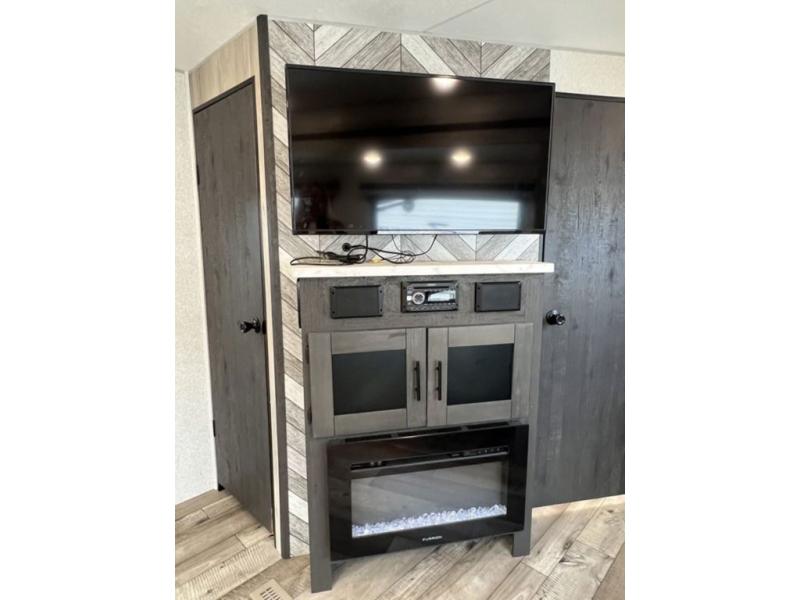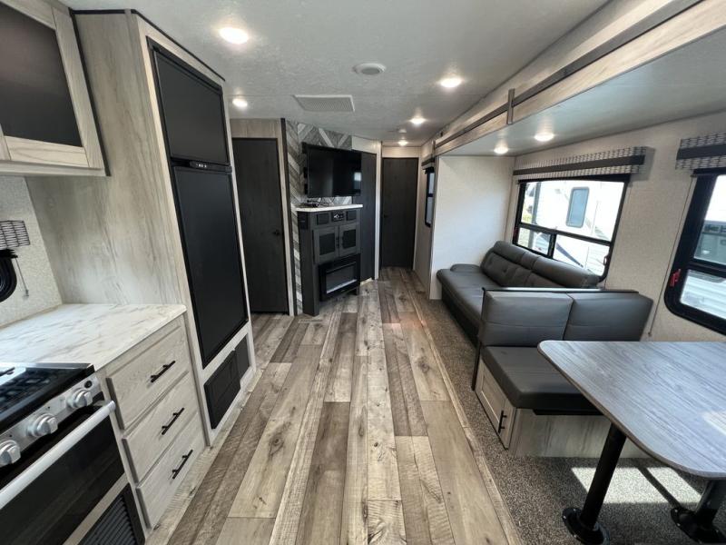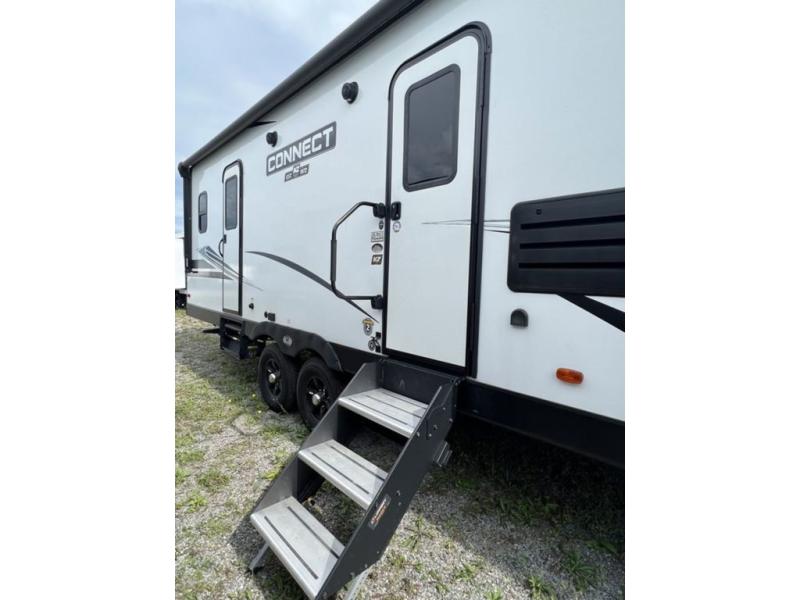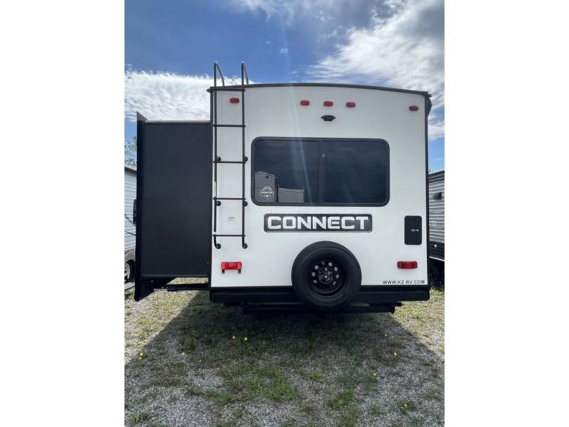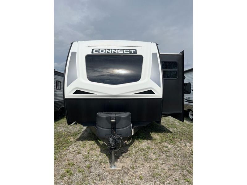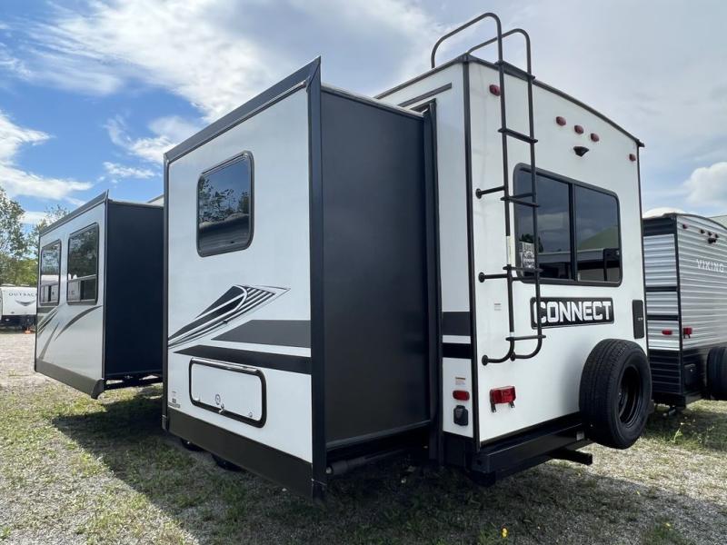 You can use this Connect travel trailer whenever you want to get away! You will remain comfortable each night sleeping in the rear master suite, and this bedroom area even has the second exterior entry door so that you can slip out for your morning run easily. The front kitchen has a full-width countertop for lots of extra space to chop veggies and prep meals, and the large slide in the main living area holds the booth dinette and 70" sofa. These pieces of furniture rest across from the fireplace for a cozy evening with a cup of coffee, and there is a walk-in pantry where you can grab snacks.
