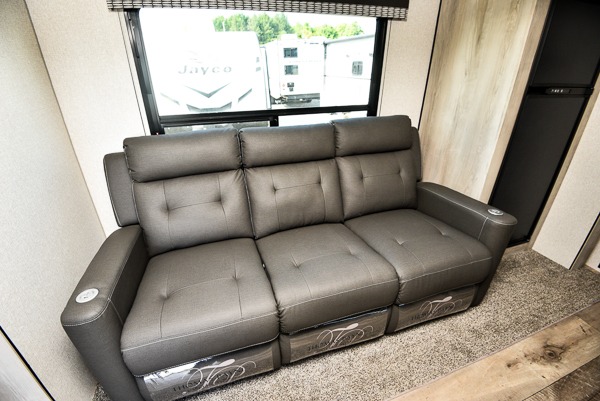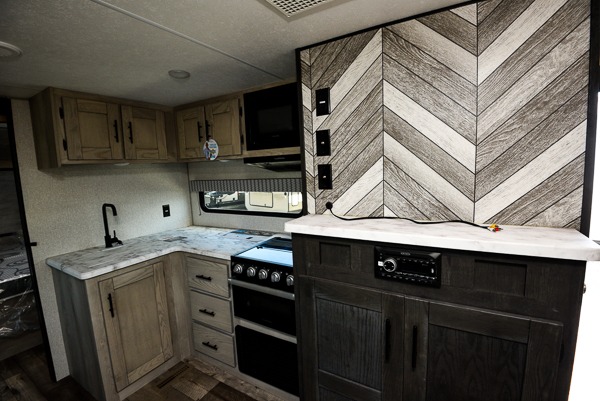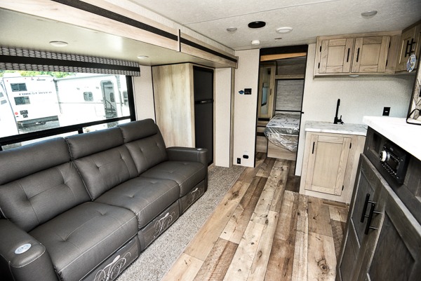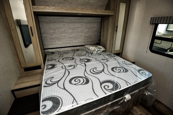 Inside comforts are found throughout this trailer from the theater dinette with a table and a 10 cu. ft. refrigerator within the slide out, to the rear full bathroom with a space savings door. Outside, you will find comfort under the 16' power awning while relaxing as you decide what to do next. The pass-through storage gives you a place for your larger items like camping chairs, portable stove, charcoal and outdoor games. The cook will love the L-shaped countertop and kitchen appliances, plus the walk-in pantry includes coat hooks. At night, head to the front to enjoy your own queen bed with clothing storage on each side, plus there is a TV mount if you want to add your own TV.