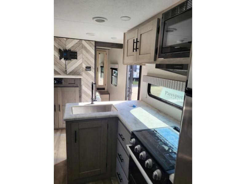 Get ready for outdoor fun at your favorite campground or RV park, and relaxation both outside and inside this trailer! The 18' power awning provides protection from the elements and the LED light strip allows you to stay up late, the outside kitchen and griddle provide amenities to make meals in the great outdoors, plus the trunk door and the pass-through storage give you access to stow items away. When you are ready to call it a night, there is a queen bed in the front private bedroom, double-size bunks next to the full bathroom, and a U-shaped dinette slide offers extra sleeping space. The next morning, the cook can make meals using the L-shaped kitchen with full amenities, or head back outdoors to use the outside amenities.