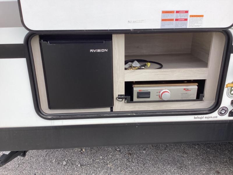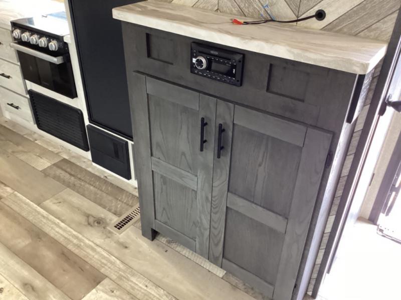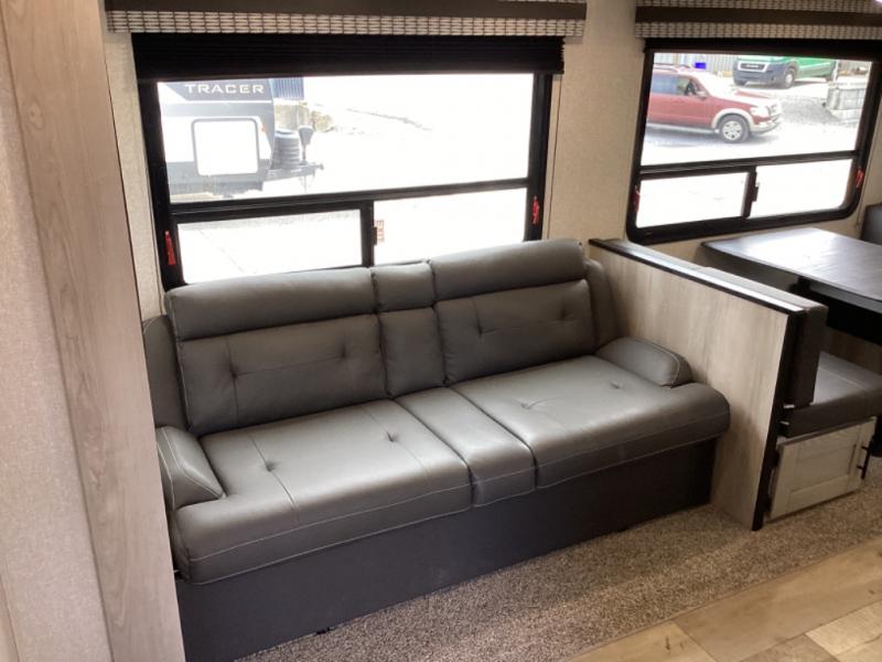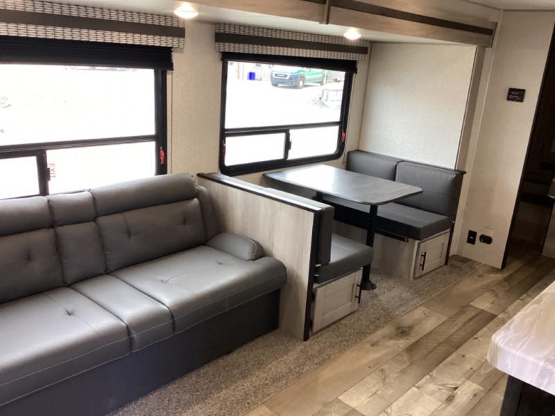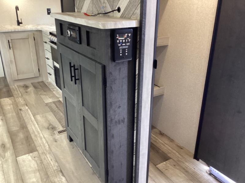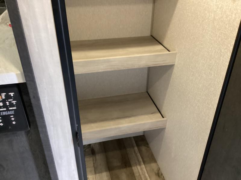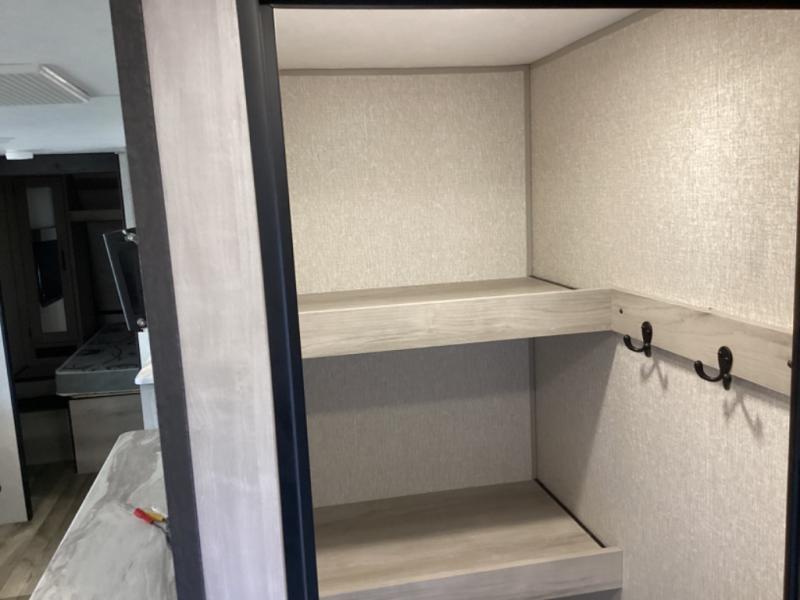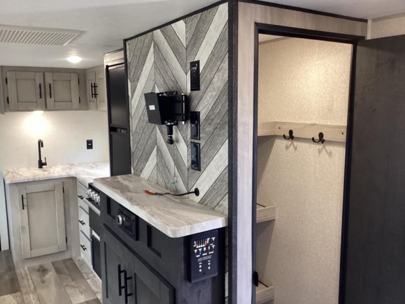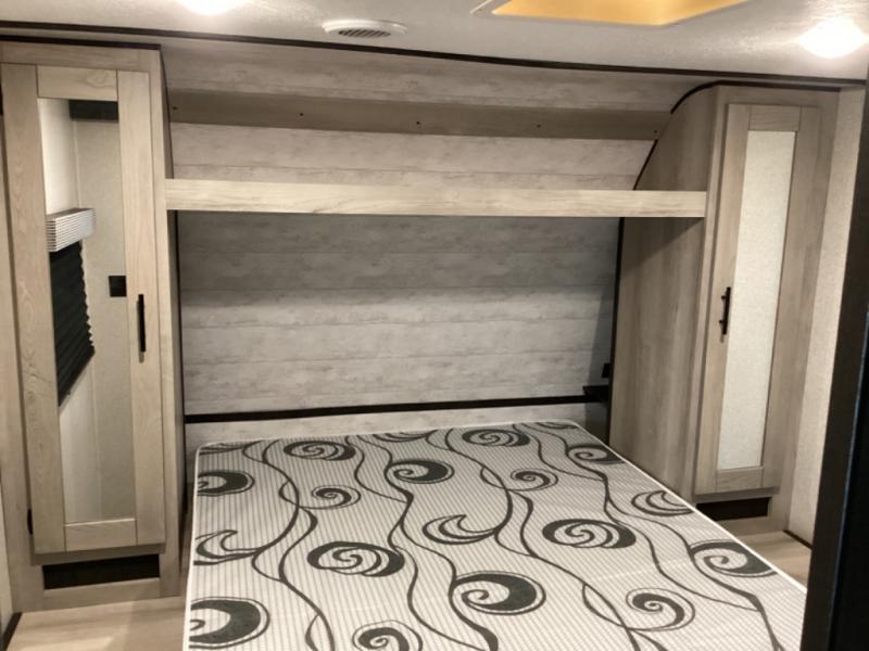 Headed to the RV park with your family and friends? Want enough space to allow overnight guests to stay the night on occasion? This trailer gives you double-size bunks, a 70" sofa and a booth dinette that offer extra sleeping space while you enjoy your own walk-around queen bed in the front private bedroom. You will also have dual wardrobes, and a TV mount to add your own TV. Everyone will stay refreshed and cleaned using the rear corner full bathroom, and fed by the cook that has an inside kitchen with full amenities including an L-shaped counter and a large sink. There is also a walk-in pantry with coat hooks next to the entry to utilize as a multi-purpose closet. And there is an outside kitchen with a griddle and a refrigerator, a 20' power awning with an LED light strip, and a pass-through storage for the larger camping items.