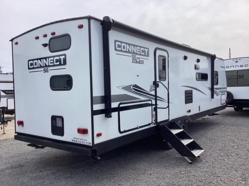 Each Connect SE travel trailer by KZ includes an NXG frame foundation that is constructed with high-strength low-alloy prime steel, uses the CNC controlled rail fabrications and camber, plus eliminates frame failures, construction issues, and corrosion! The Climate package provides added insulation to extend your camping season year-round with a fully enclosed, insulated and heated underbelly to protect the tanks and pipes. Some top features include the 17-inch range with illuminated control knobs, the seamless countertops with a deep undermount stainless steel kitchen sink including a sink cover for added countertop space, and a black high-rise faucet. You will also enjoy the KZ Engage package that is powered by OneControl to monitor and control the battery levels, the slide(s), the leveling system, the awning(s), plus the inside and outside lighting. Choose your favorite today!
