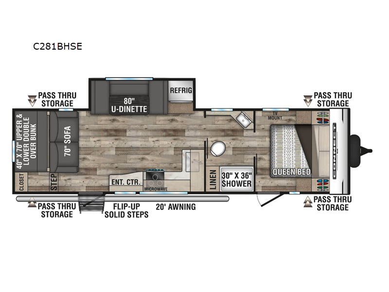 When you enjoy convenience, comfort and extra sleeping space for everyone, this trailer has you covered from the 40" x 70" bunk beds to the front private bedroom. The bunk beds are located in the rear and include a closet. Step down into the main living and kitchen area to find a 70" sofa and a U-shaped dinette to relax on, and an L-shaped kitchen area with a large sink, and full amenities, plus there is an entertainment center. As you head to the bedroom, you will walk-through the bathroom which includes extra counter space for your toiletries and linen storage. The walk-around queen bed has a wardrobe on each side, as well as the second entry into the trailer for a smooth flow of traffic when everyone joined you on the trip.