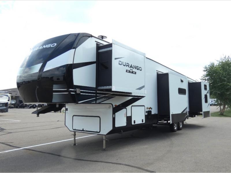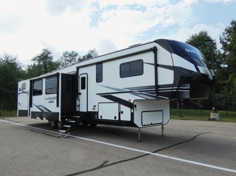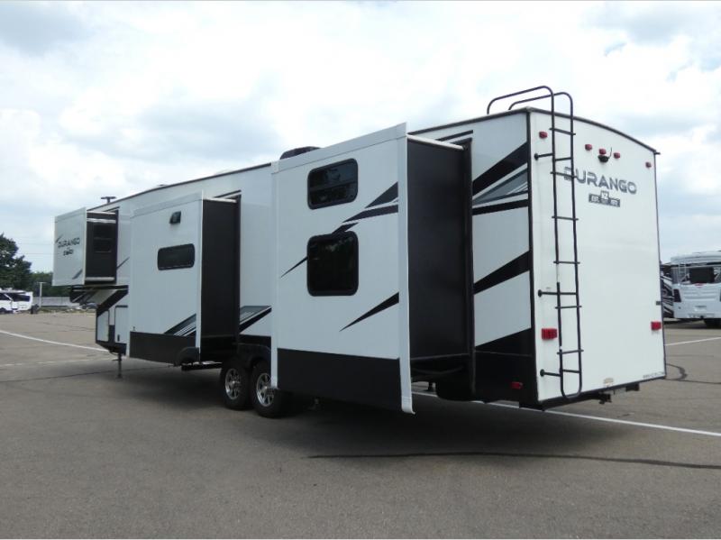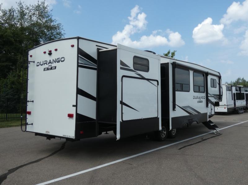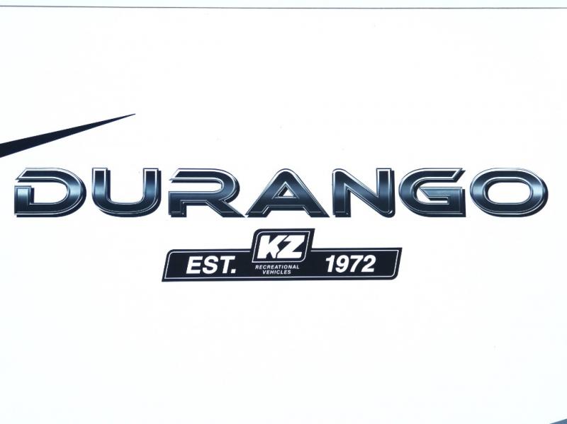 Enjoy full time living, an affordable price, and a wide body construction for more living space with every one of these KZ Durango light high-profile fifth wheels! These luxury units can be used all year round with the all-weather insulation package, the 3" x 14" foam-core in-floor straight-line heating system w/ a 35,000 BTU furnace, and the 15,000 BTU ducted roof A/C which optimizes the airflow by an average of 40% for better performance, cooling time, and reduction of noise. A few other construction features you will appreciate include a one piece, seamless walk-on Tufflex roofing material, Pex® in-floor heated waterlines, a Lamilux® gelcoat fiberglass exterior, and Dexter® axles with self adjusting brakes and height adjusting hangers.