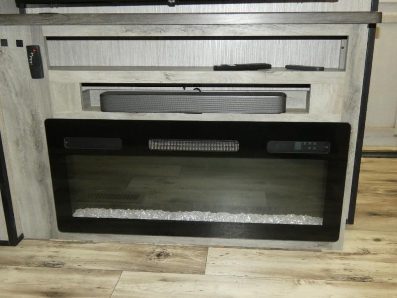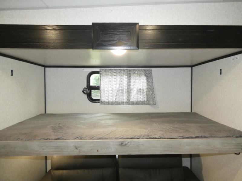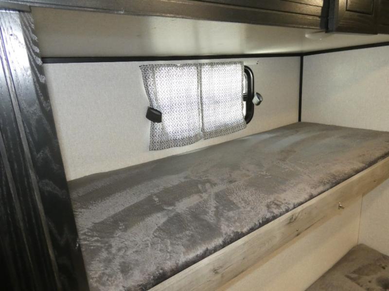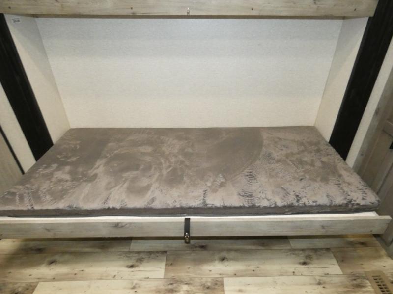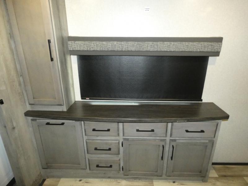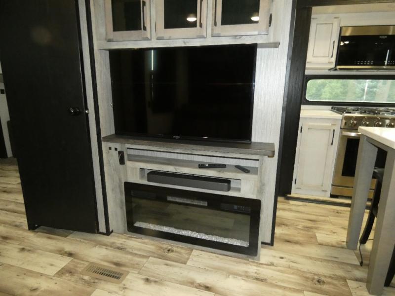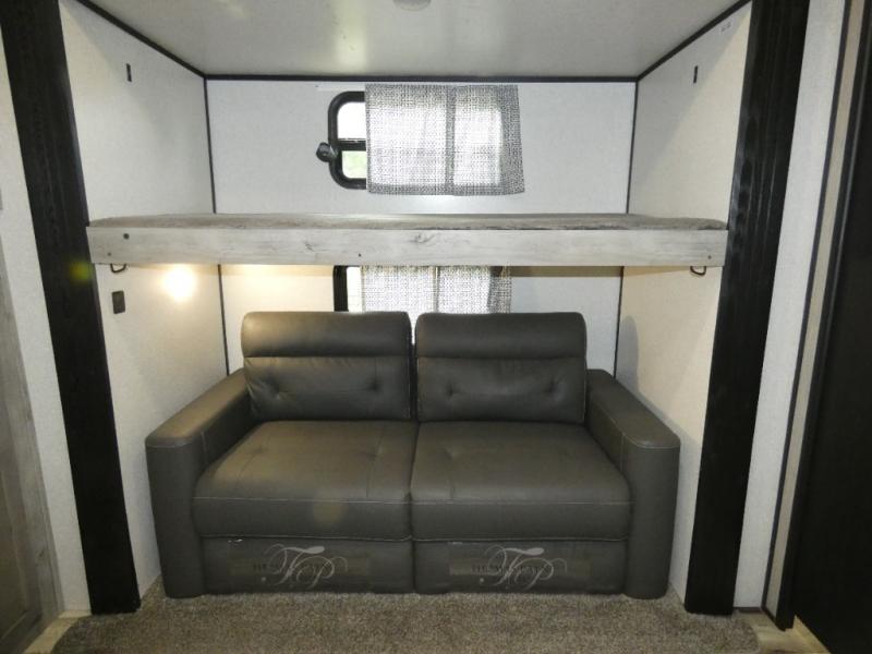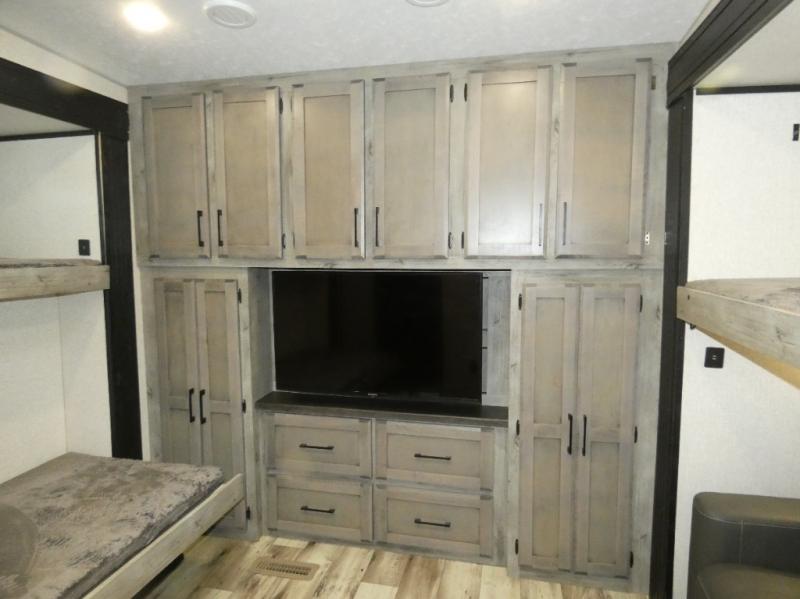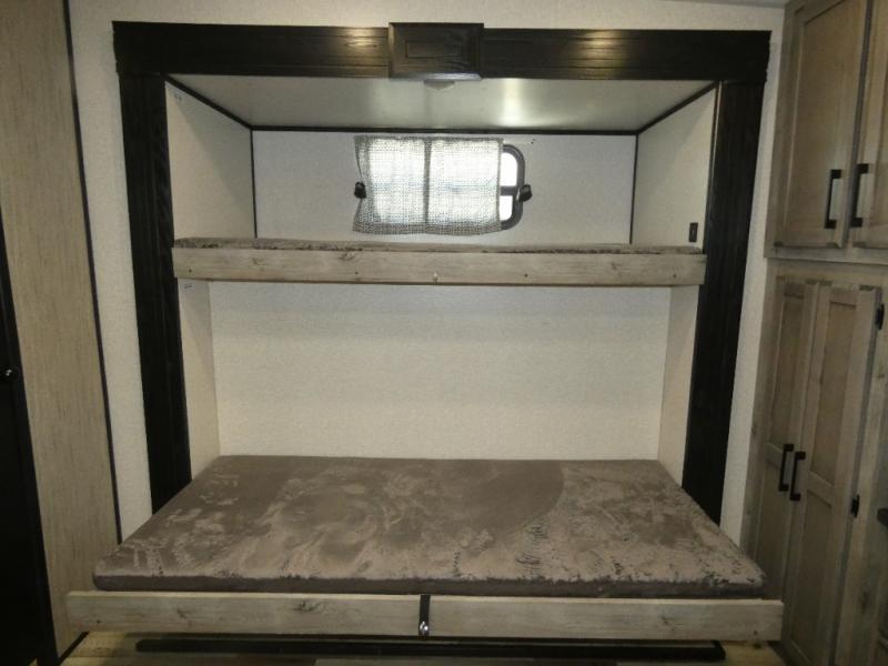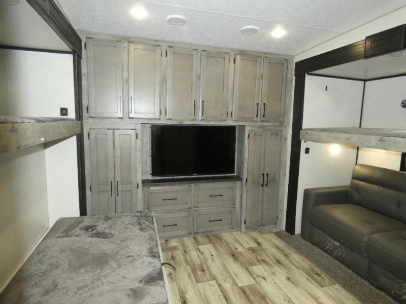 All of your friends and family can camp together in this fifth wheel! It features a rear private bunkhouse with a bunk above a hide-a-bed sofa, a full bathroom with a 30" x 36" shower, an entertainment center with wardrobes on either side, a folding bunk, and a bunk over the outside kitchen. Across from the hide-a-bed sofa is an entertainment center with a 40" fireplace and a 50" smart TV to watch your favorite movies at night. The kitchen island comes with two bar stools and you can prepare your best meals with the four burner range with a 24" oven. The second bathroom has a 48" x 30" residential shower with a seat and a linen closet to keep your towel close. Enjoy a good night's rest on the king bed slide in the front private bedroom which also has a dresser with a built-in hamper and a front wardrobe.