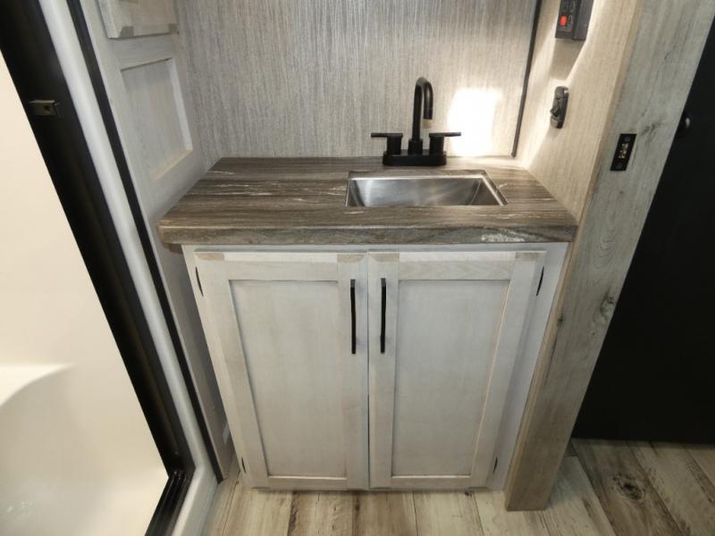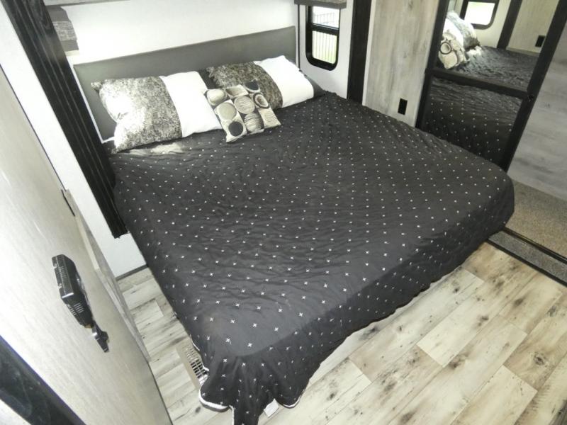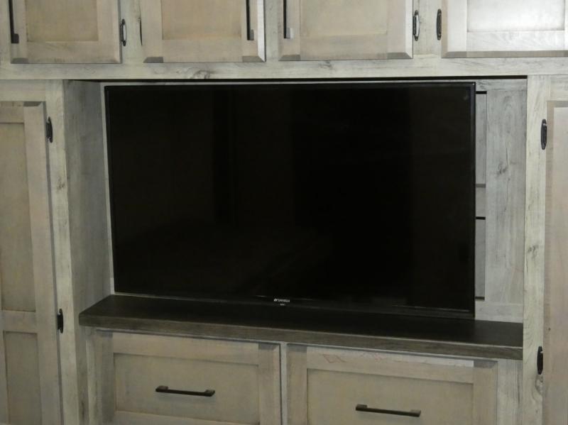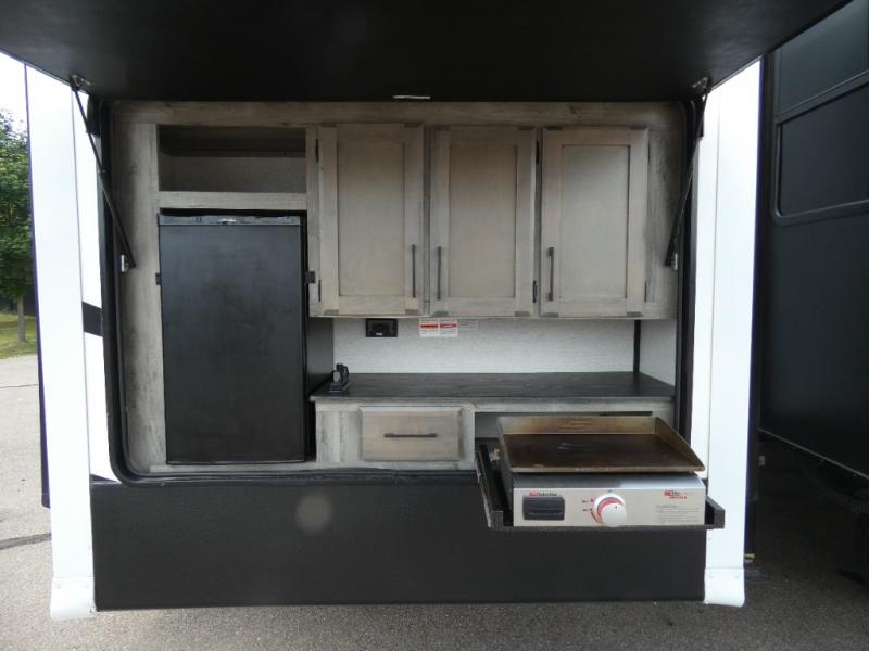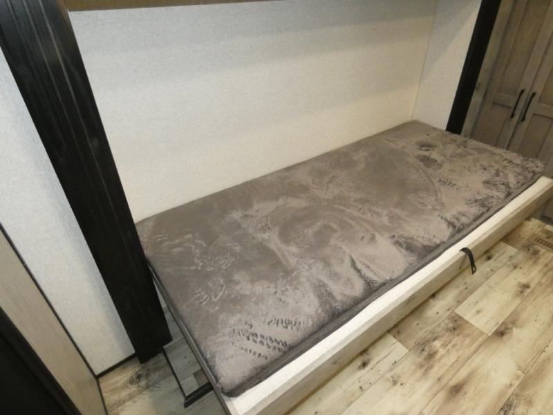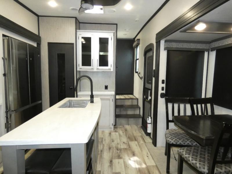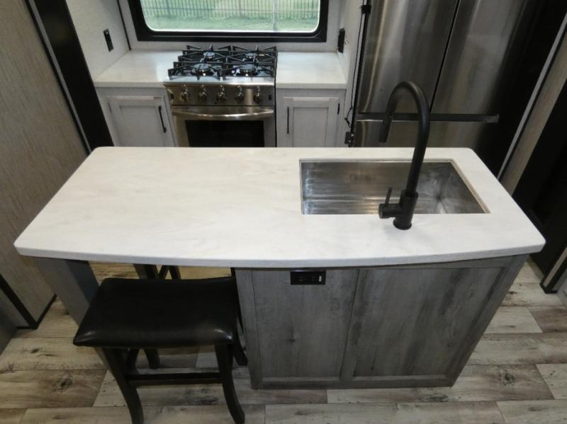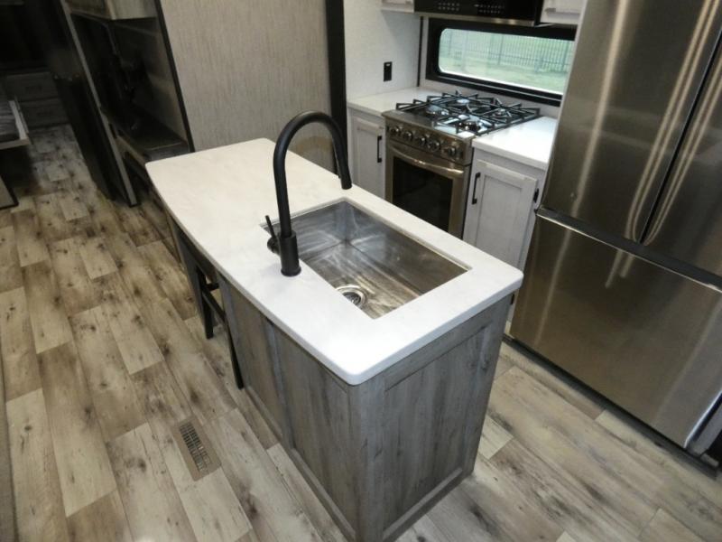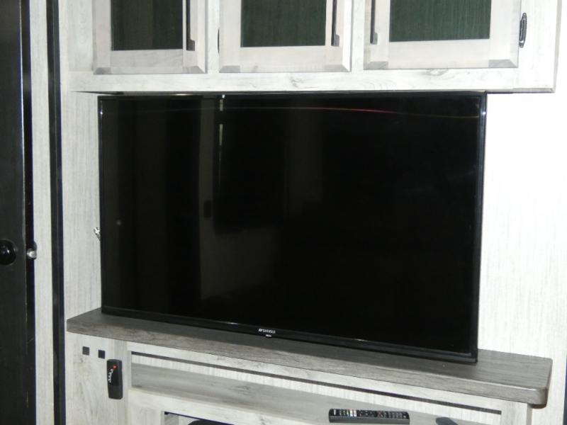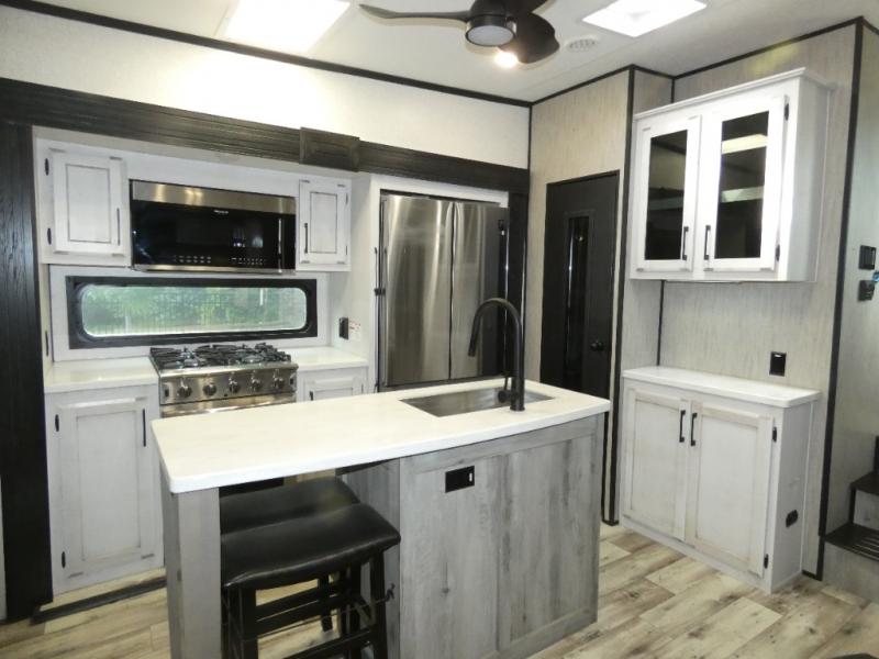 All of your friends and family can camp together in this fifth wheel! It features a rear private bunkhouse with a bunk above a hide-a-bed sofa, a full bathroom with a 30" x 36" shower, an entertainment center with wardrobes on either side, a folding bunk, and a bunk over the outside kitchen. Across from the hide-a-bed sofa is an entertainment center with a 40" fireplace and a 50" smart TV to watch your favorite movies at night. The kitchen island comes with two bar stools and you can prepare your best meals with the four burner range with a 24" oven. The second bathroom has a 48" x 30" residential shower with a seat and a linen closet to keep your towel close. Enjoy a good night's rest on the king bed slide in the front private bedroom which also has a dresser with a built-in hamper and a front wardrobe.