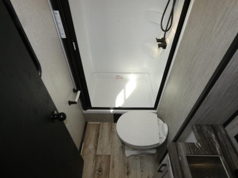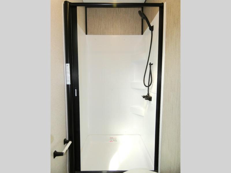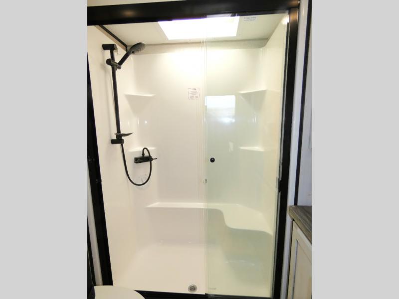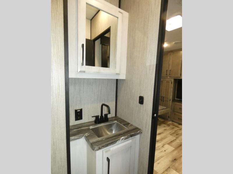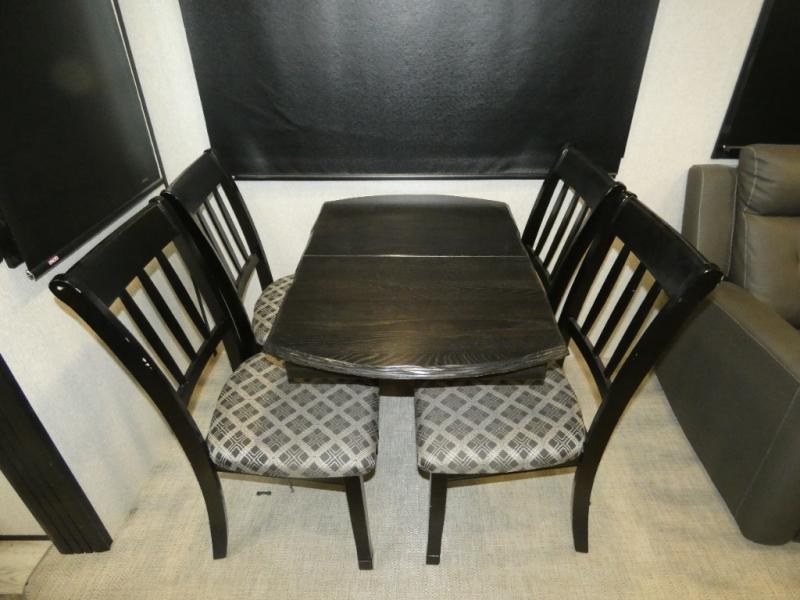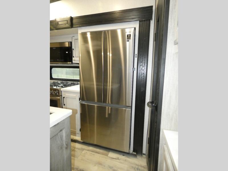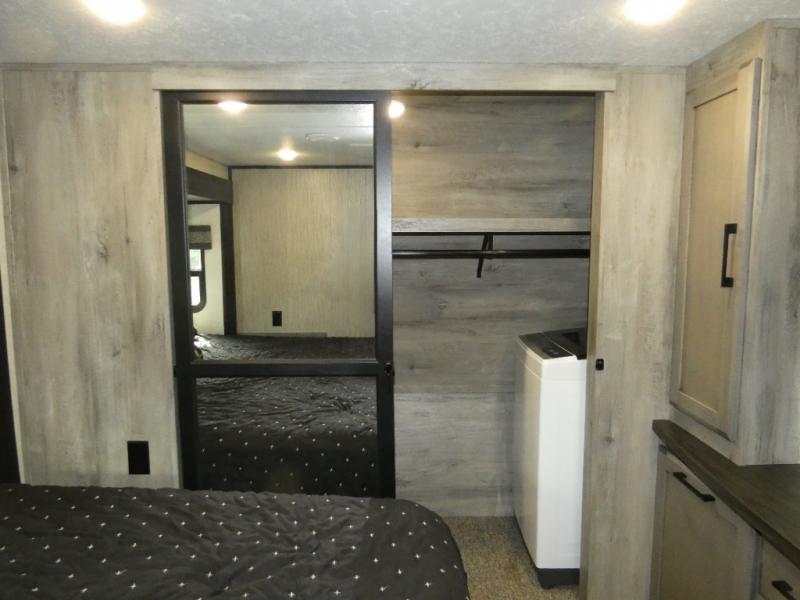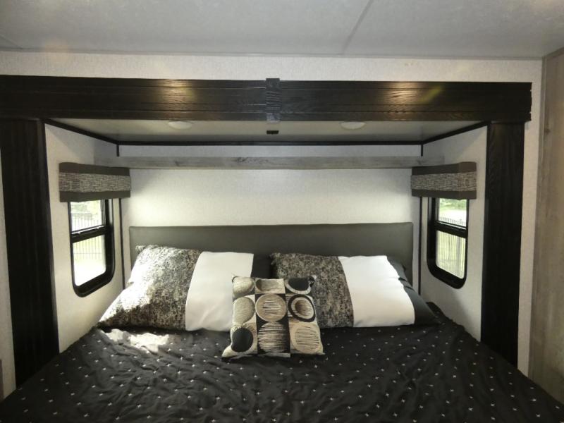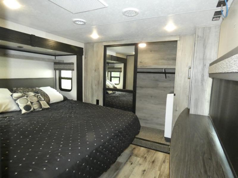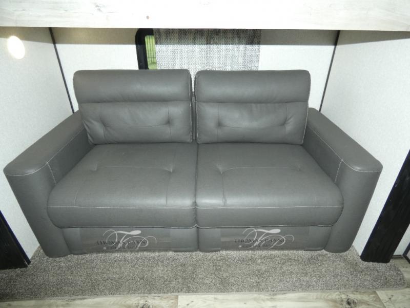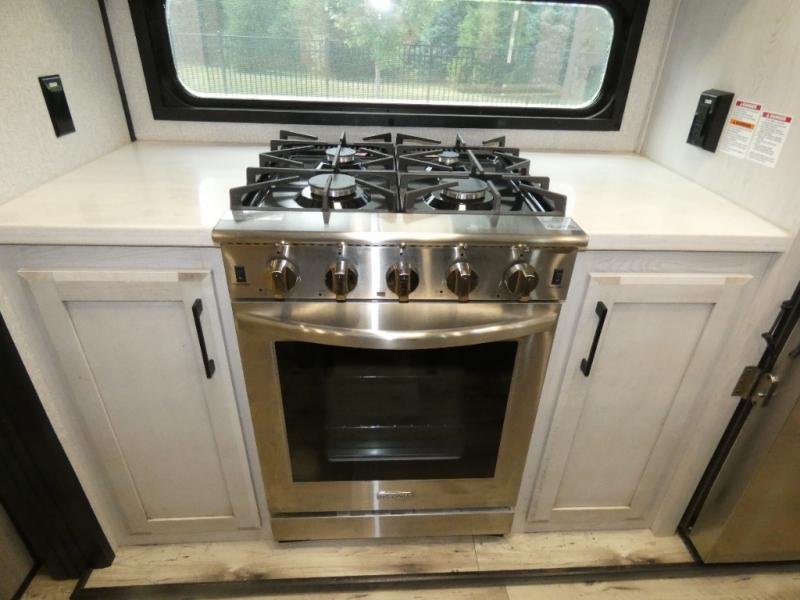 All of your friends and family can camp together in this fifth wheel! It features a rear private bunkhouse with a bunk above a hide-a-bed sofa, a full bathroom with a 30" x 36" shower, an entertainment center with wardrobes on either side, a folding bunk, and a bunk over the outside kitchen. Across from the hide-a-bed sofa is an entertainment center with a 40" fireplace and a 50" smart TV to watch your favorite movies at night. The kitchen island comes with two bar stools and you can prepare your best meals with the four burner range with a 24" oven. The second bathroom has a 48" x 30" residential shower with a seat and a linen closet to keep your towel close. Enjoy a good night's rest on the king bed slide in the front private bedroom which also has a dresser with a built-in hamper and a front wardrobe.