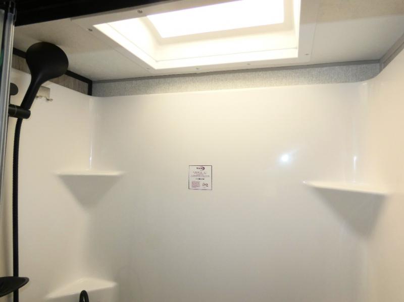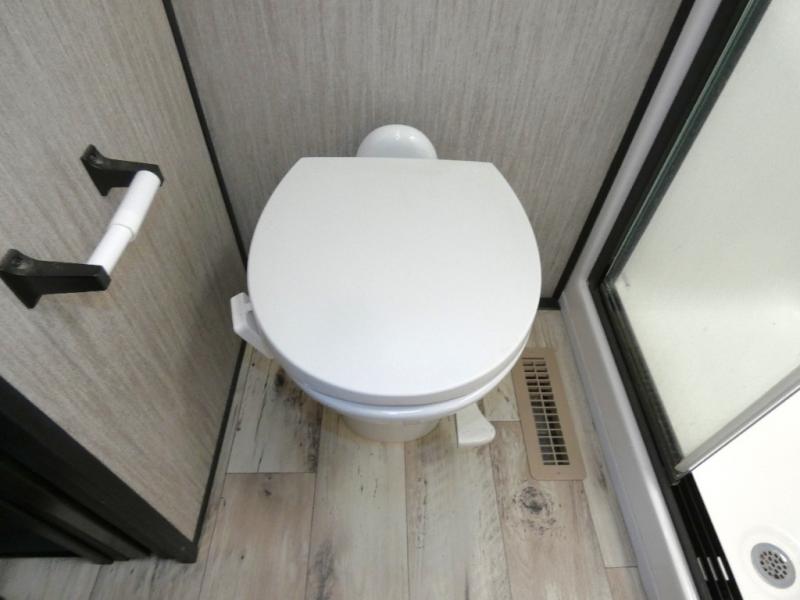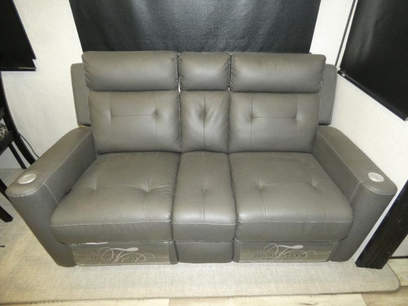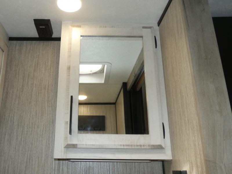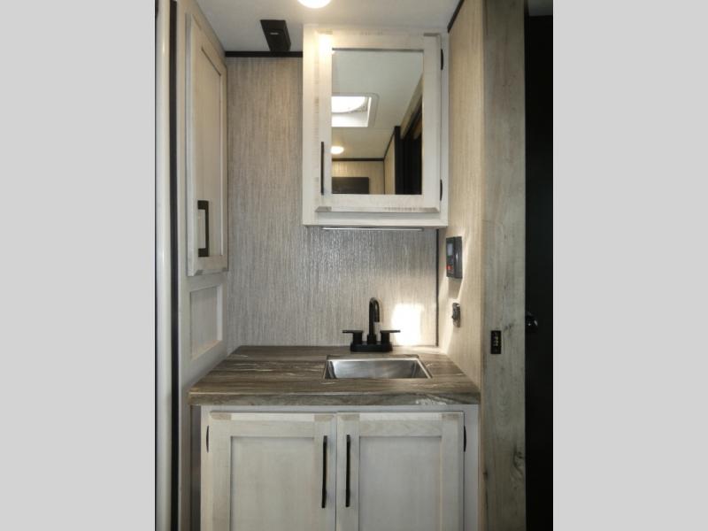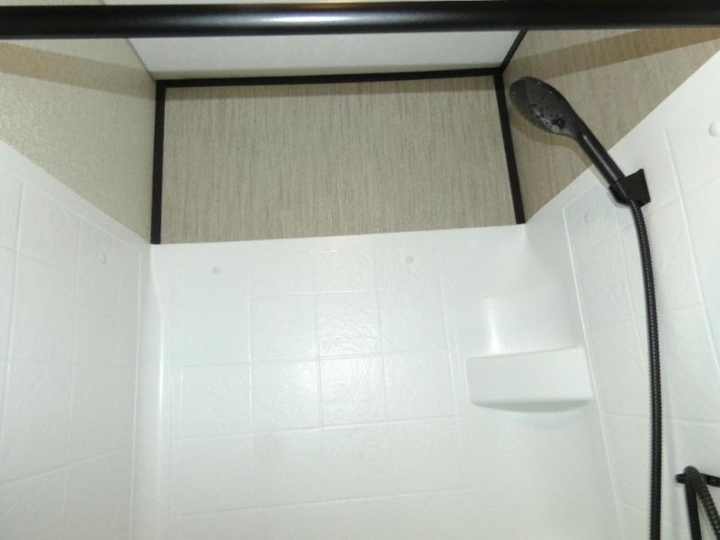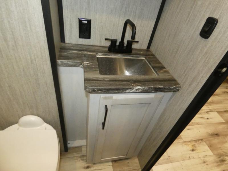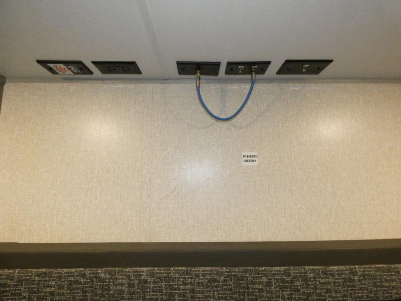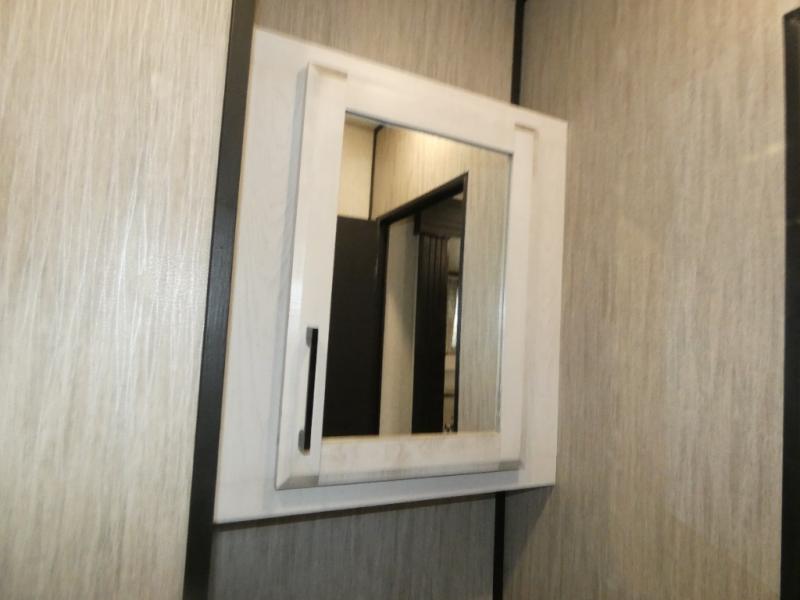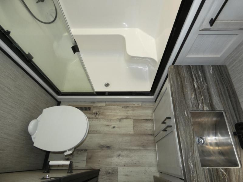 All of your friends and family can camp together in this fifth wheel! It features a rear private bunkhouse with a bunk above a hide-a-bed sofa, a full bathroom with a 30" x 36" shower, an entertainment center with wardrobes on either side, a folding bunk, and a bunk over the outside kitchen. Across from the hide-a-bed sofa is an entertainment center with a 40" fireplace and a 50" smart TV to watch your favorite movies at night. The kitchen island comes with two bar stools and you can prepare your best meals with the four burner range with a 24" oven. The second bathroom has a 48" x 30" residential shower with a seat and a linen closet to keep your towel close. Enjoy a good night's rest on the king bed slide in the front private bedroom which also has a dresser with a built-in hamper and a front wardrobe.