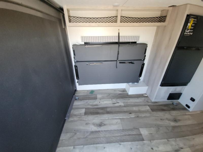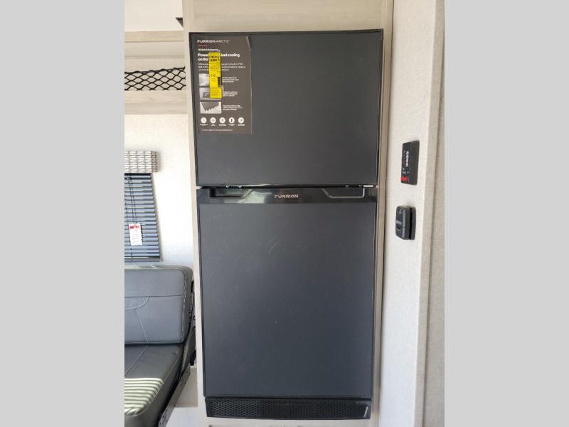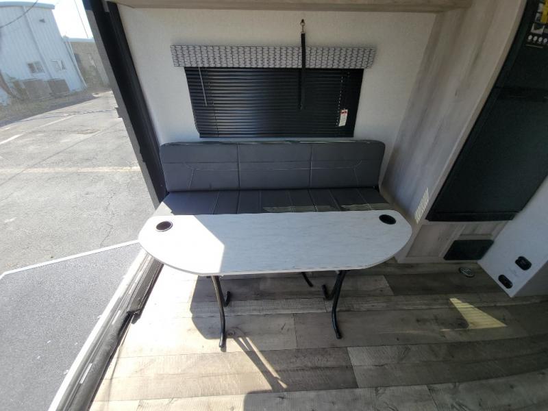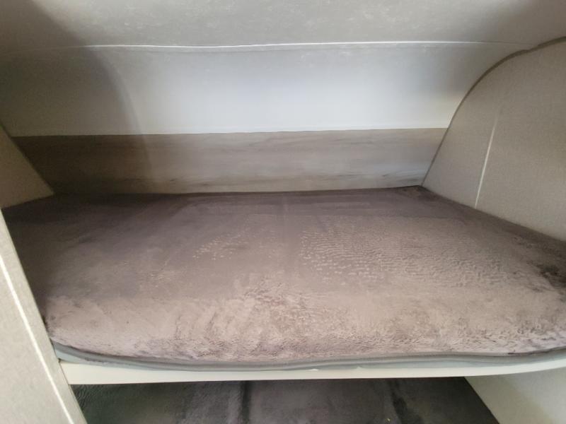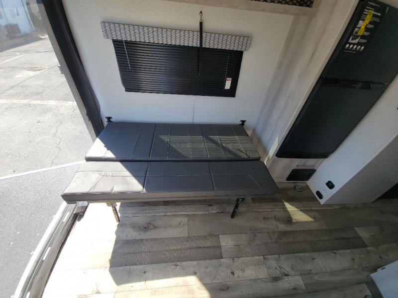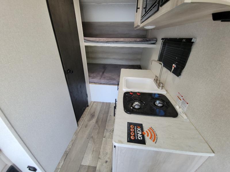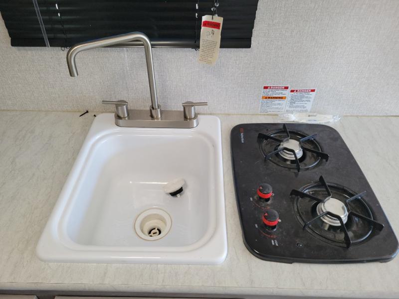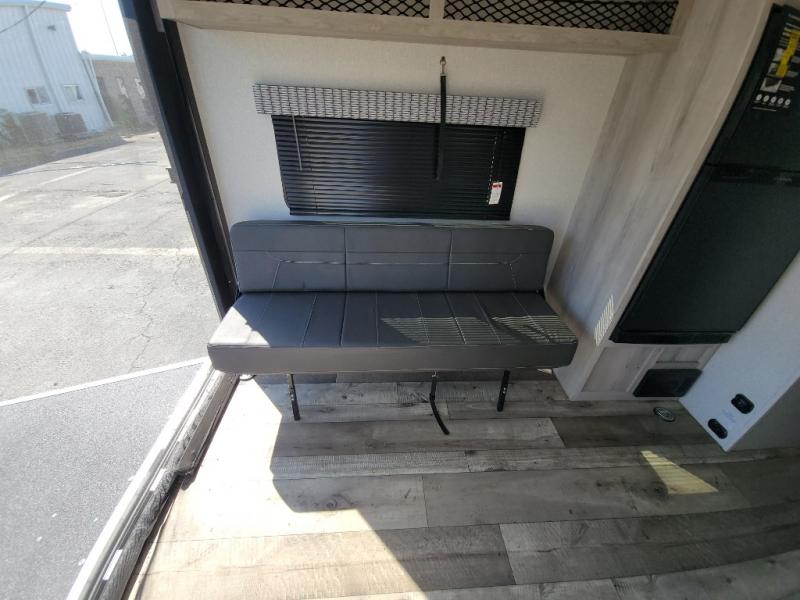 Now you can have the best of both worlds with this toy hauler in tow! A little bit of play during the day, and a lot of comfort in the evening. You can freshen up after a trail ride in the bath that includes a spacious shower and a toilet, and then head to the kitchen to prepare a meal on the two burner cooktop. There is also a microwave oven and an 8 cu. ft. 12V refrigerator for perishables. This model features 9' cargo space for your riding toys and a 78" x 73 1/2" ramp door for easy unloading. Once your dirt bikes are out, you can relax on the flip-up sofa.