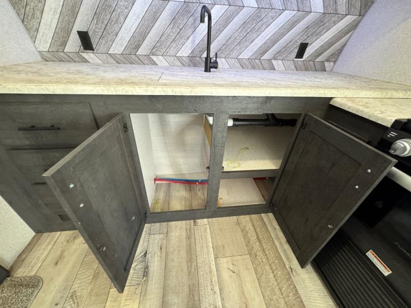 This couple's trailer is perfect to take on weekend excursions or campgrounds across the country. You will feel more at home with your own private bedroom in the back that includes a comfy queen bed and dual shirt closets to keep your clothes wrinkle-free. The full bath is close by for convenience, and here you'll find a shower surround, a foot-flush toilet, and a linen closet for clean towels. Head to the main living area to relax on the jackknife sofa within the slide out. You can dine at the dinette in front of the sofa, and if you have an overnight guest they can sleep here. This model also includes a spacious front kitchen with tons of counter space, plus there is a pantry to store snacks galore!