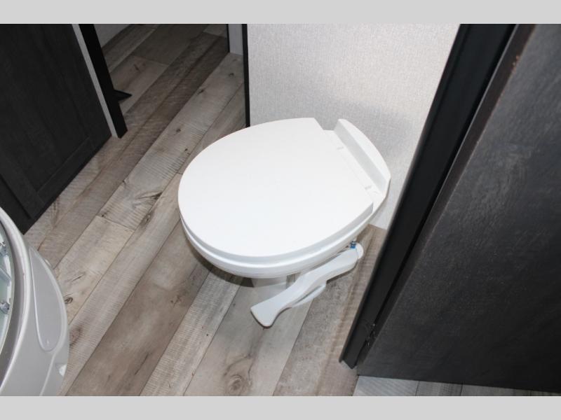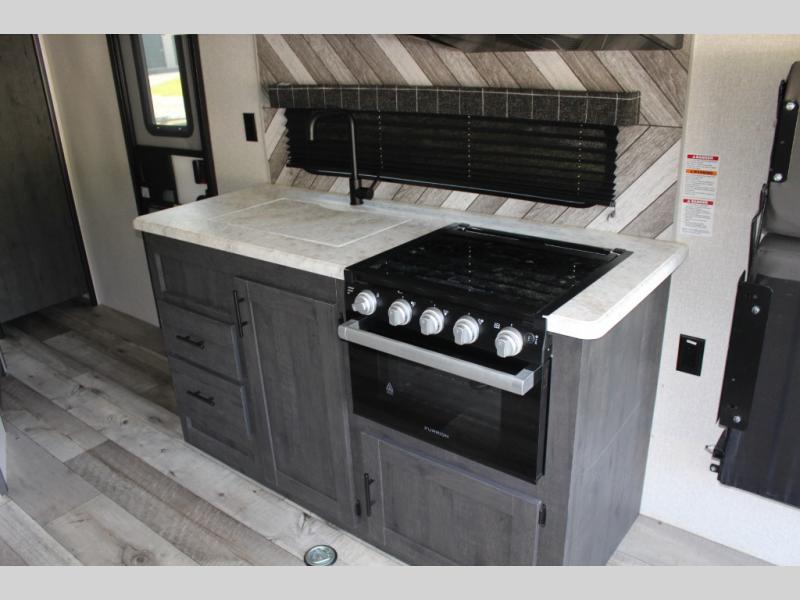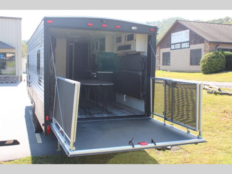 Get ready for a fun weekend kicking up mud in this toy hauler! The 8' 6" cargo area with 10' 11" total space allows you to bring along bikes or kayaks, and you can choose to add the optional screen door to keep the bugs out. After you've whipped up a meal on the three burner cooktop, you can enjoy it at the two tables in front of the rollover sofas before heading out for the day. You and your spouse will appreciate the front private bedroom with a queen bed, dual shirt closets, and private access into the dual entry bath. And all your riding and hiking gear can go in the exterior pass-through storage!