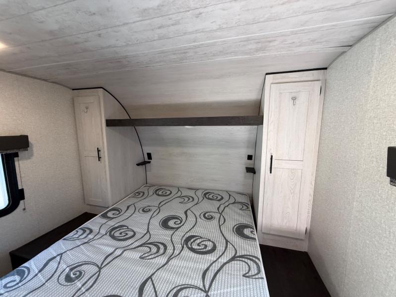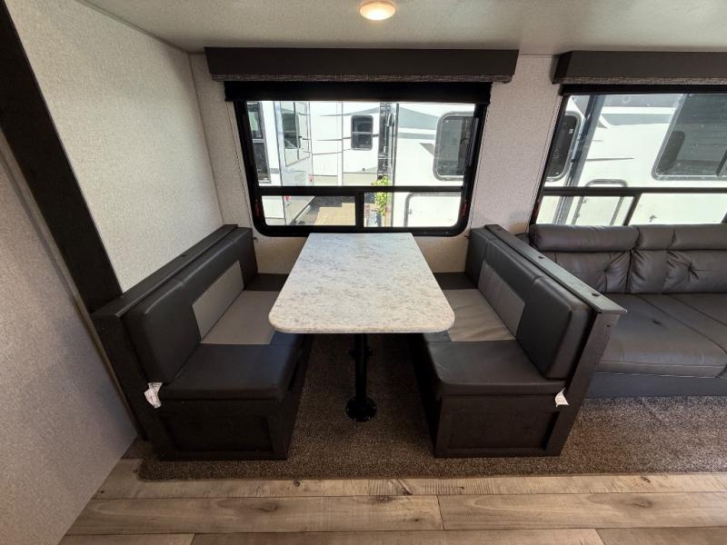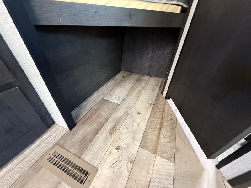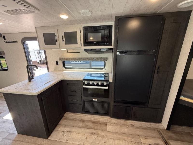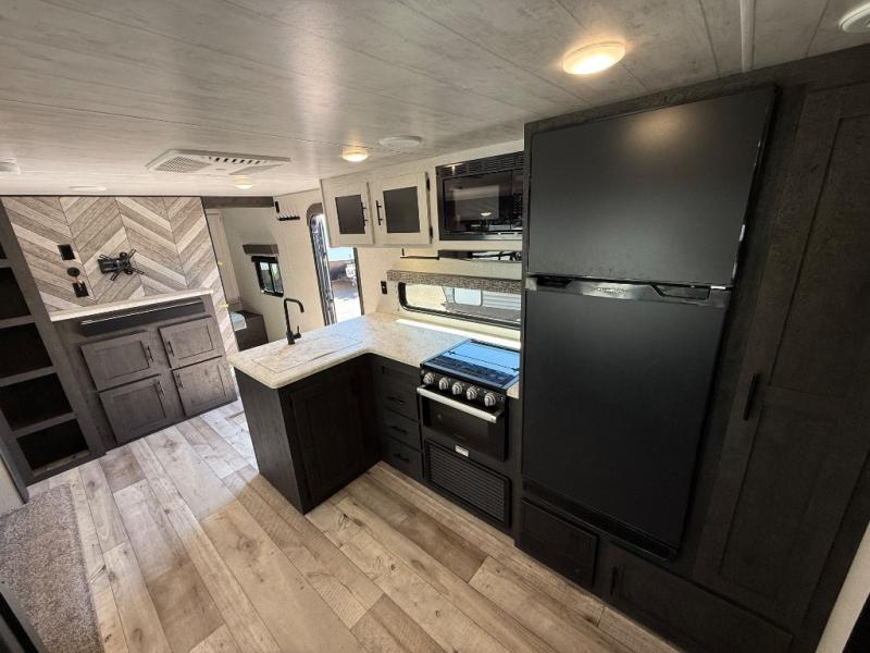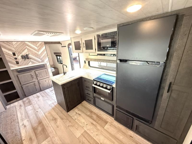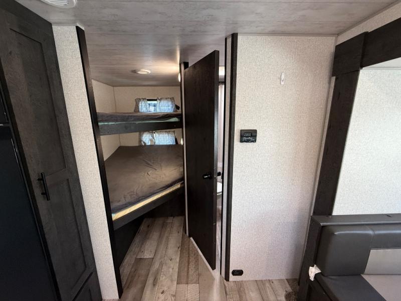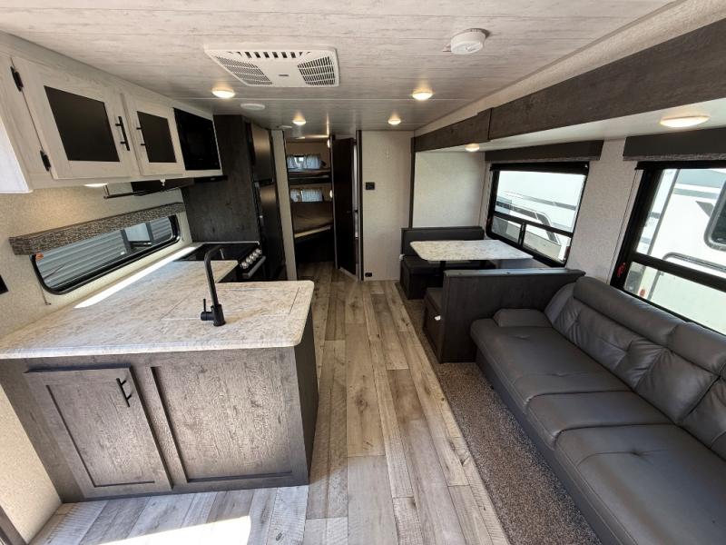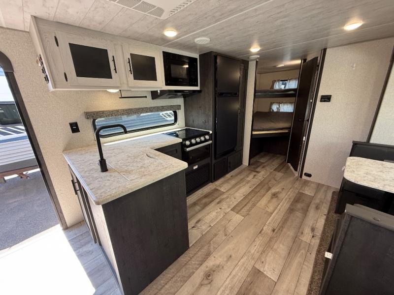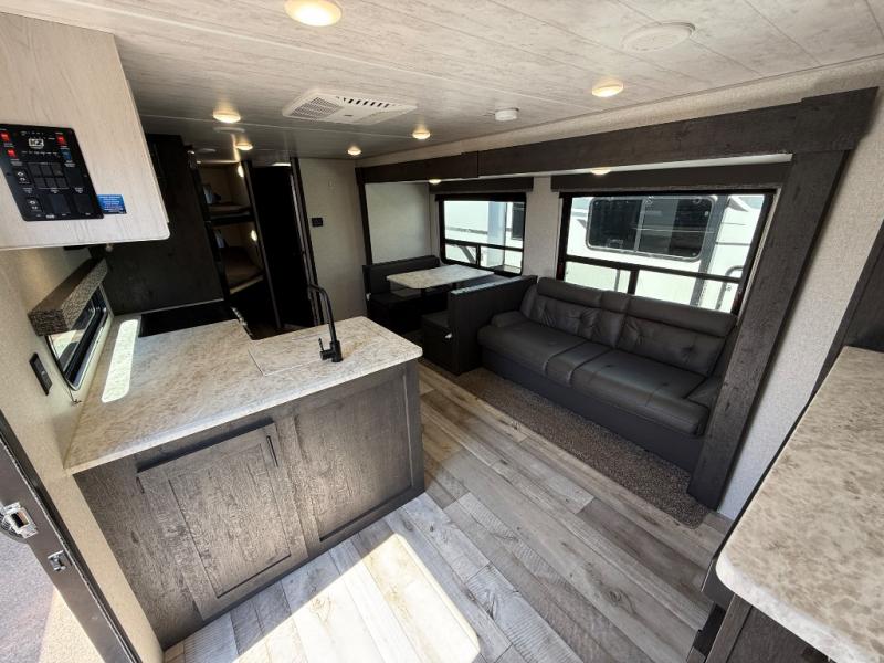 You're going to love the extra interior space in this travel trailer thanks to the large slide out! You'll find the 42" booth dinette and 70" sofa here, and there is an entertainment center and storage nearby to keep board games. If the weather is nice, you will probably find everyone outside since this model includes an outside kitchen with a refrigerator and a griddle, plus there is a 19' power awning with LED lights! When it's time to call it a night, you will appreciate your own private bedroom up front with a queen bed, and your guests can sleep on the double-size bunks or the dinette and sofa!