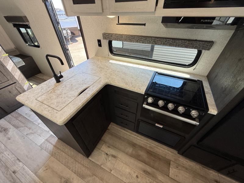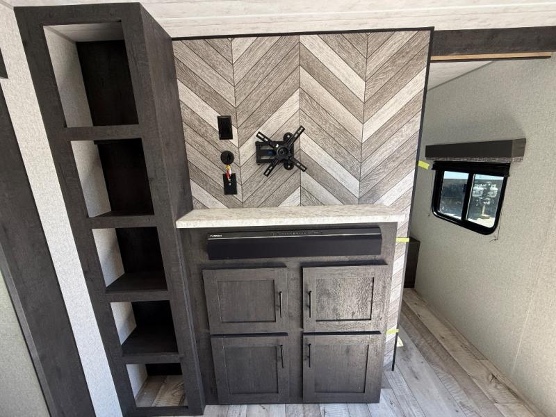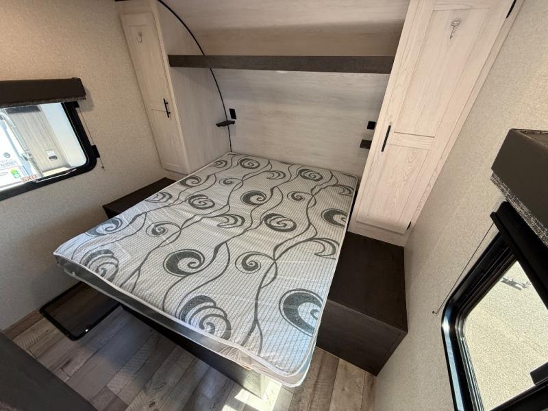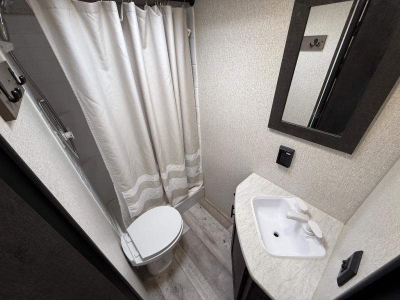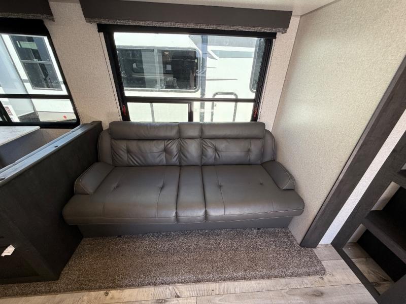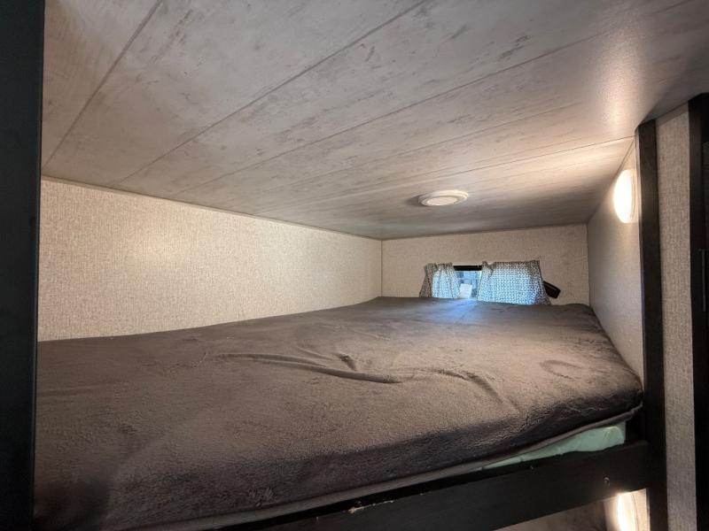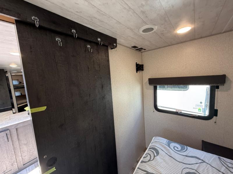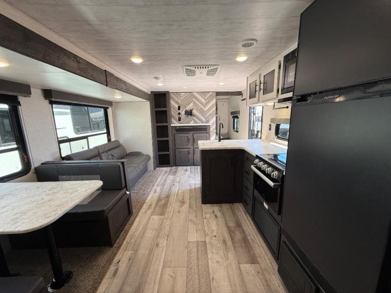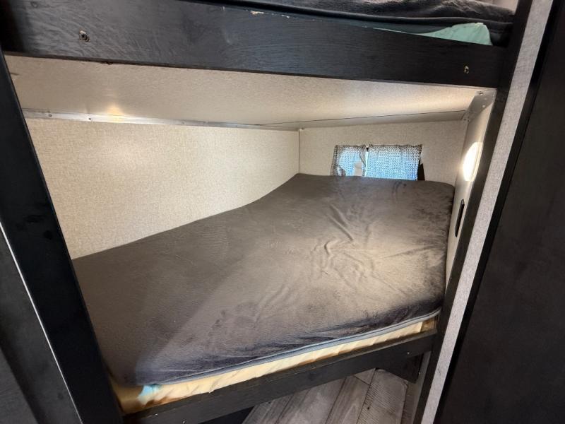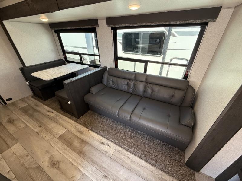 You're going to love the extra interior space in this travel trailer thanks to the large slide out! You'll find the 42" booth dinette and 70" sofa here, and there is an entertainment center and storage nearby to keep board games. If the weather is nice, you will probably find everyone outside since this model includes an outside kitchen with a refrigerator and a griddle, plus there is a 19' power awning with LED lights! When it's time to call it a night, you will appreciate your own private bedroom up front with a queen bed, and your guests can sleep on the double-size bunks or the dinette and sofa!