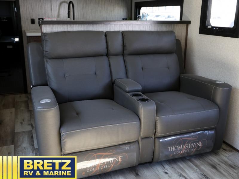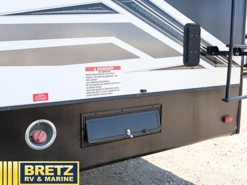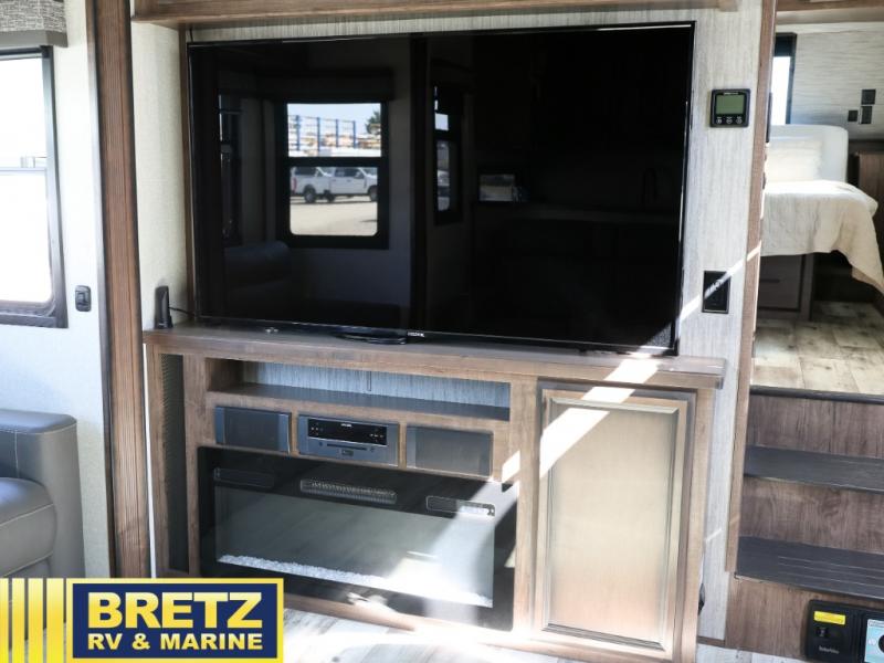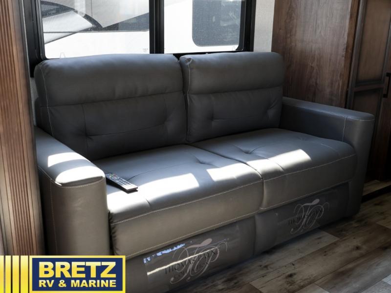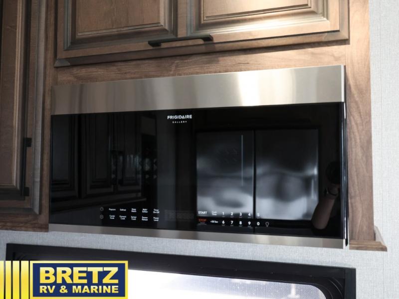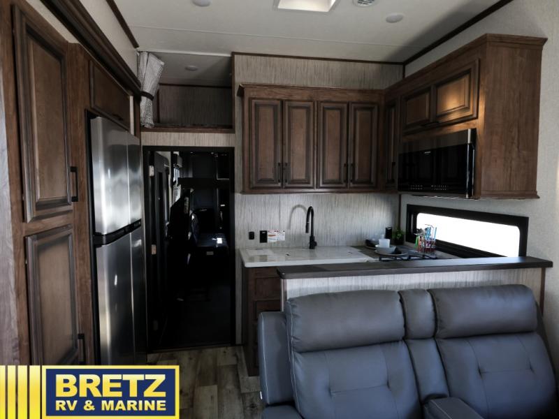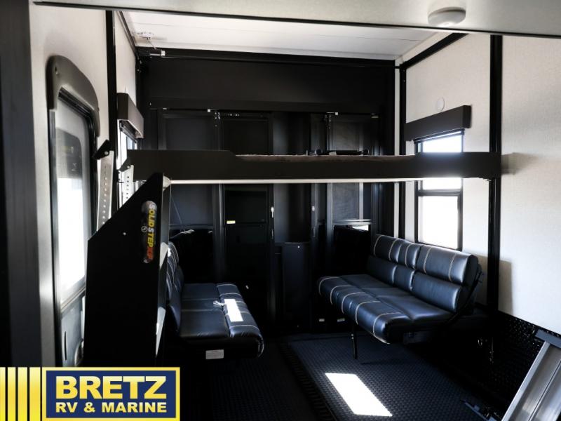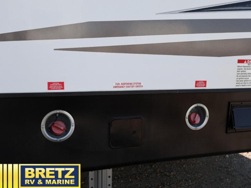Choosing a luxury fifth wheel toy hauler can be easy when you see all the features that are included in the interior and along the exterior! Beginning with the 70 gallon fuel tank to keep the toys running once at your destination, the pass-through storage for the larger camping items, and the 14' power awning offering an outdoor living space. The separate garage becomes a place to prepare for rides or even dine and sleep when you add the optional power bed with Sit & Sleep. And the loft bed gives one more person a place to sleep. The chef of the group can prepare meals on the four burner range, or in 24" oven and the convection microwave. The kitchen counter and amenities are nearby giving you a semi-private kitchen from the main living area where you will have two sofas, theater seats and a 55" LED TV to watch with fireplace below. The full bathroom provides everything you need including a residential shower, and the front bedroom offers an electric tilt king bed with a front windshield for a view, and a wardrobe slide.
