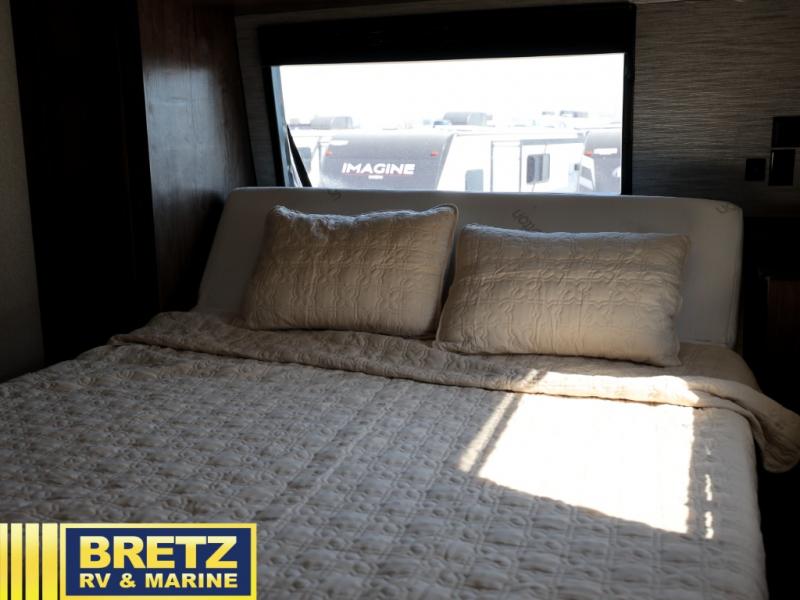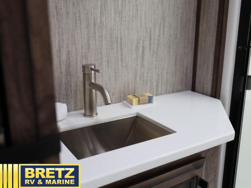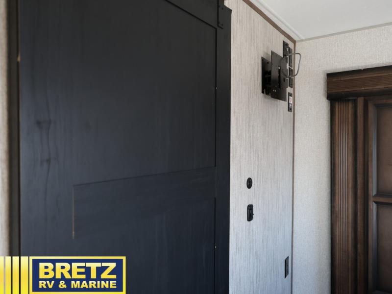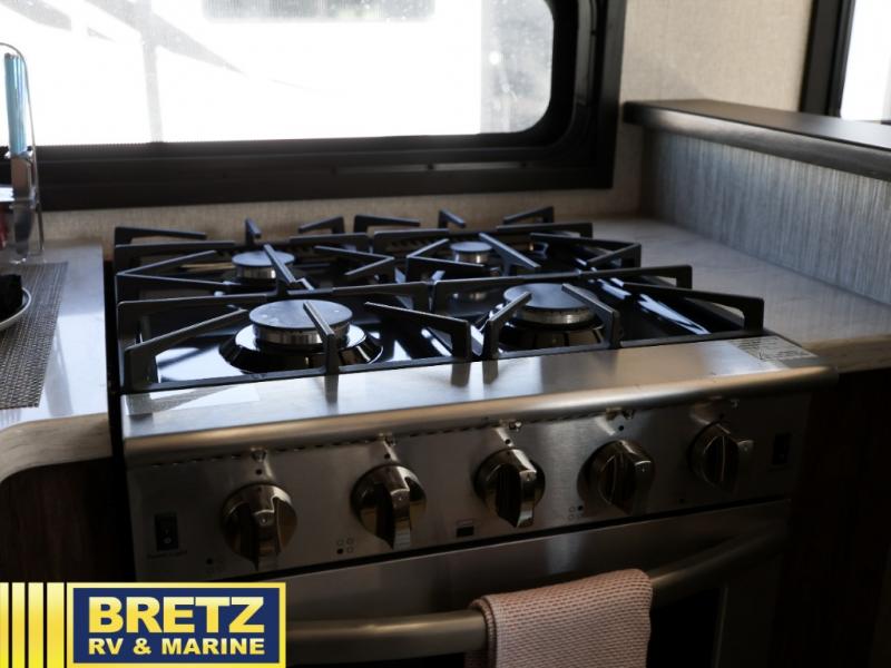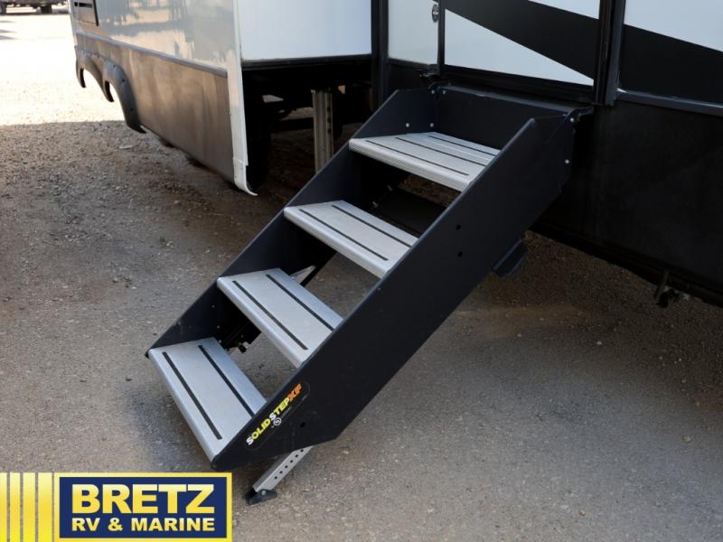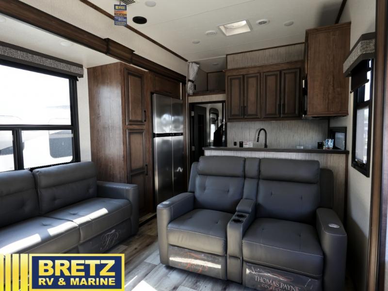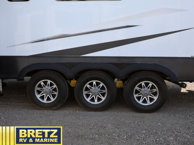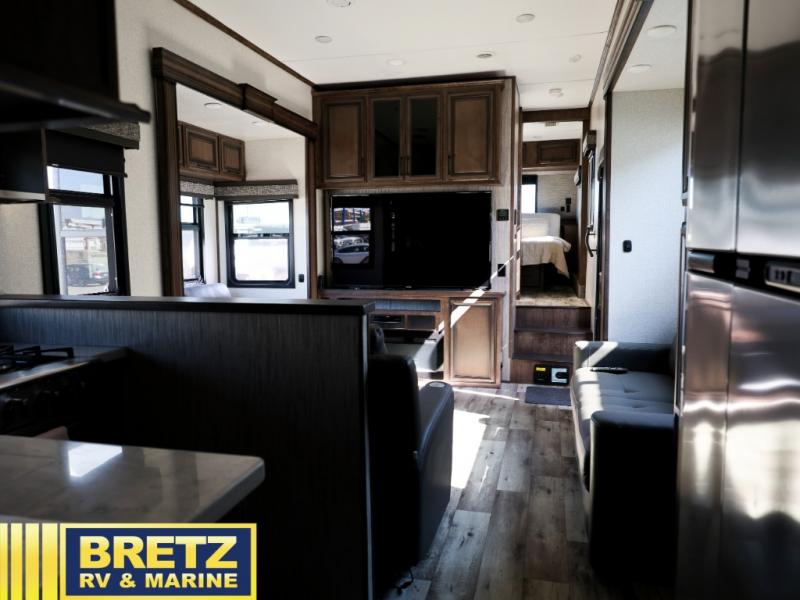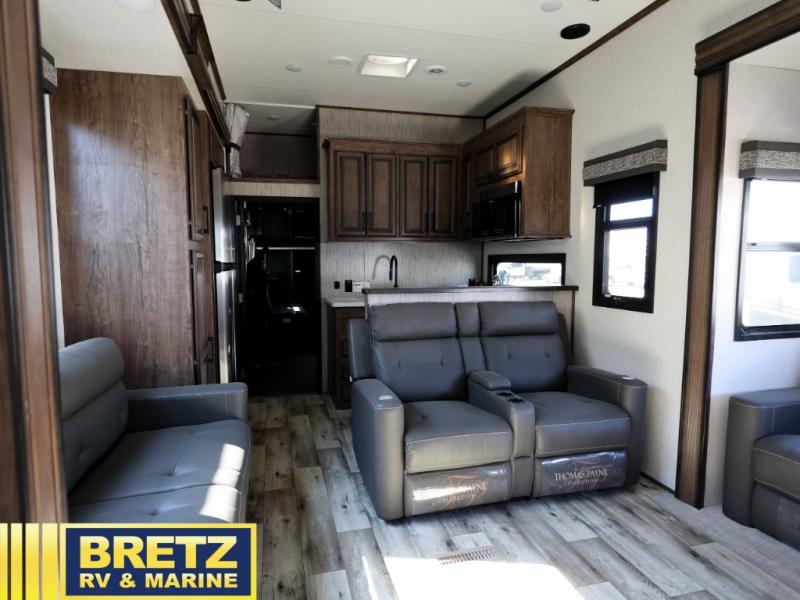 Choosing a luxury fifth wheel toy hauler can be easy when you see all the features that are included in the interior and along the exterior! Beginning with the 70 gallon fuel tank to keep the toys running once at your destination, the pass-through storage for the larger camping items, and the 14' power awning offering an outdoor living space. The separate garage becomes a place to prepare for rides or even dine and sleep when you add the optional power bed with Sit & Sleep. And the loft bed gives one more person a place to sleep. The chef of the group can prepare meals on the four burner range, or in 24" oven and the convection microwave. The kitchen counter and amenities are nearby giving you a semi-private kitchen from the main living area where you will have two sofas, theater seats and a 55" LED TV to watch with fireplace below. The full bathroom provides everything you need including a residential shower, and the front bedroom offers an electric tilt king bed with a front windshield for a view, and a wardrobe slide.