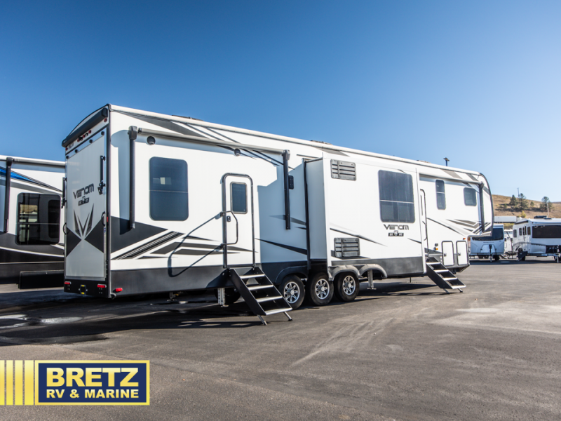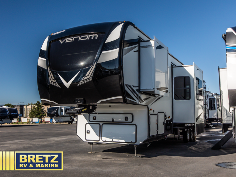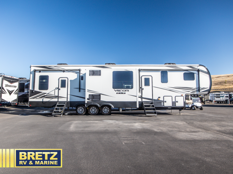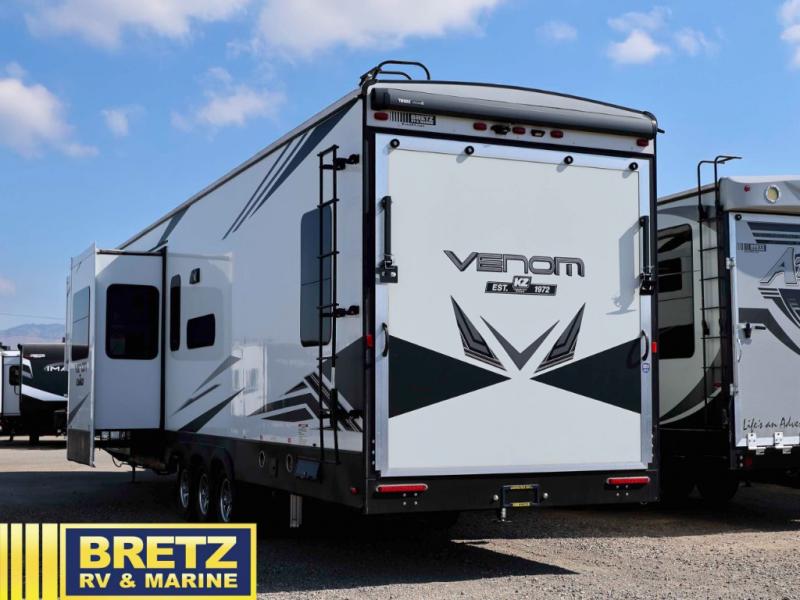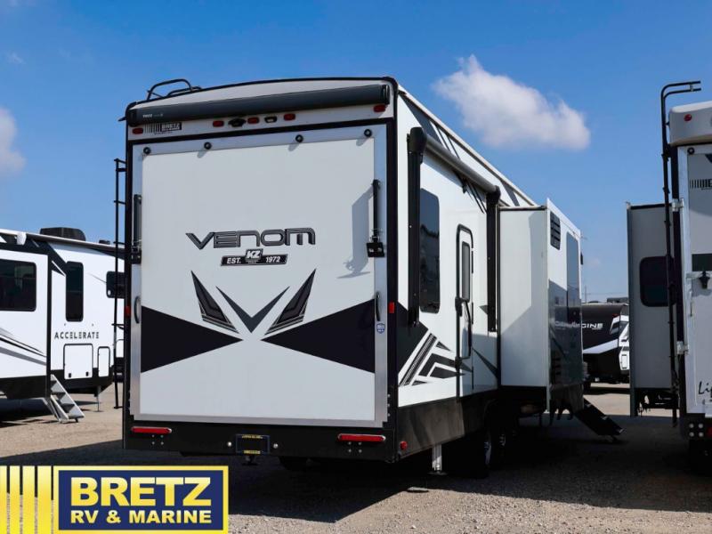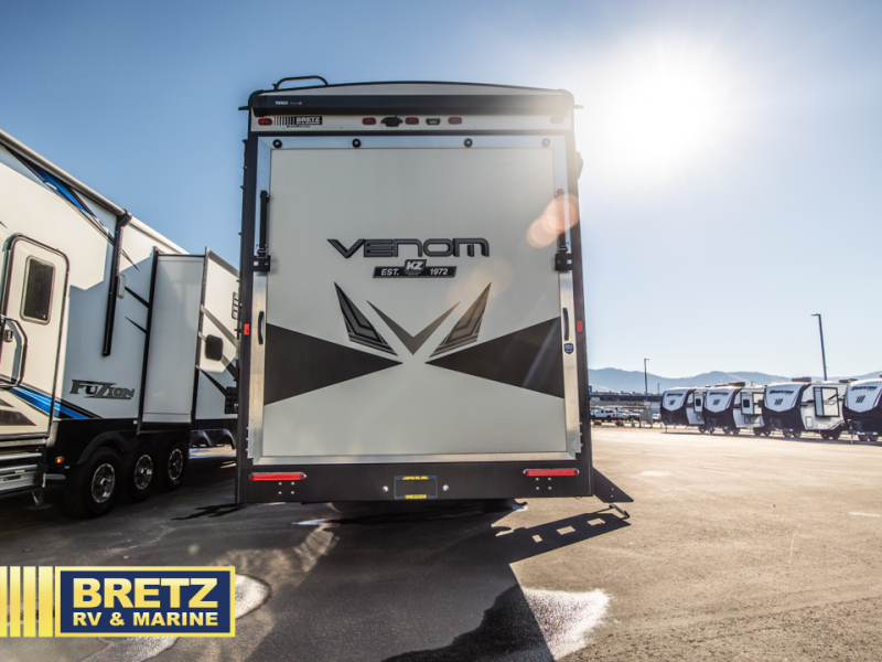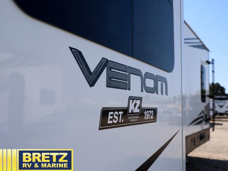 With any Venom toy hauler fifth wheel by KZ, you can be confident in the construction from the Tufflex roofing material that is flexible, reflective and puncture resistant, the extra reinforced heavy-duty front fiberglass cap, the double insulated and heated holding tanks, and the additional outside frame-to-wall floor insulation. The fully vented attic allows for unwanted moisture to escape easily, and each model includes the All Weather Insulation Package with a heated, insulated, and enclosed underbelly. Add that with the 40,000 BTU furnace and the three 15,000 BTU ducted roof A/C with Whisper Quiet cooling system, and you'll be camping all year around! The garage has been constructed with your adventures in mind with its E-Track tie-down system, built-in dovetail, and a Zero Gravity ramp door with easy-lift assist. Inside, you will enjoy residential carpet, luxury woven vinyl flooring in the slide outs, extra-large light switches, a residential one-piece fiberglass shower stall with glass doors and a built-in seat for convenience, a central vacuum system with attachments, and much much more! You can add options to customize your Venom such as the Xantrex 125AH Lithium battery with Bluetooth App controls, the "Off The Grid" solar package, the 2,000W Pure Sine Wave inverter, and/or the 7.0KW gas Onan generator, plus more!