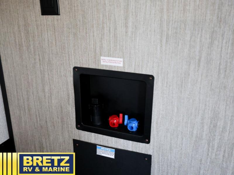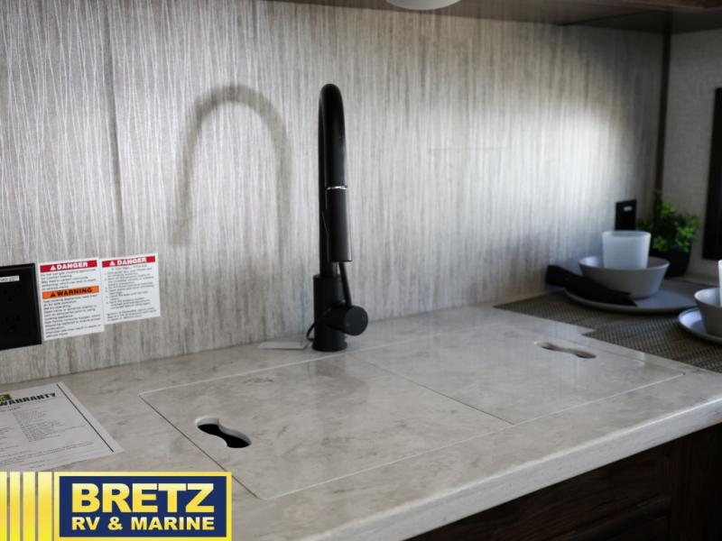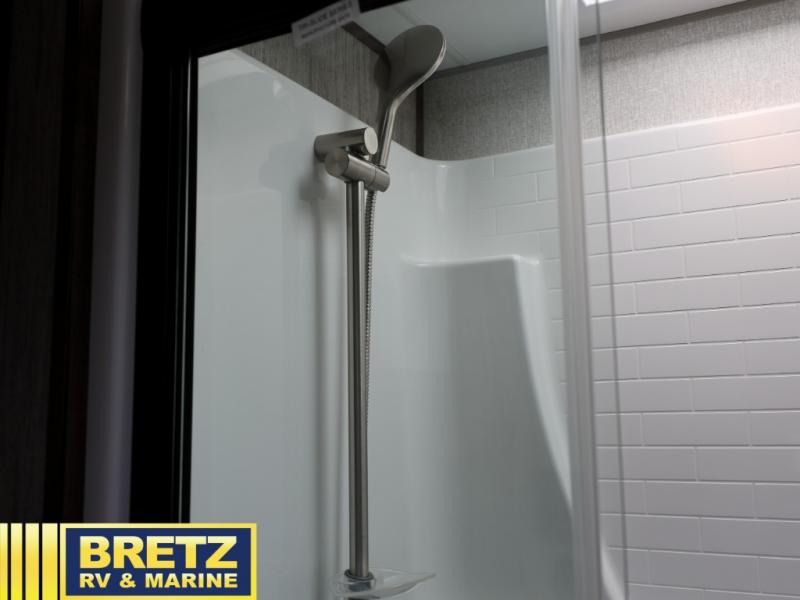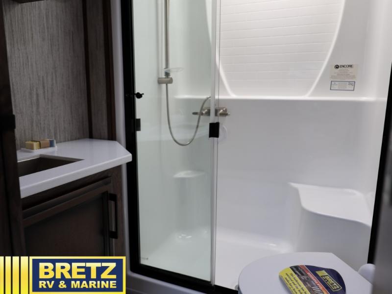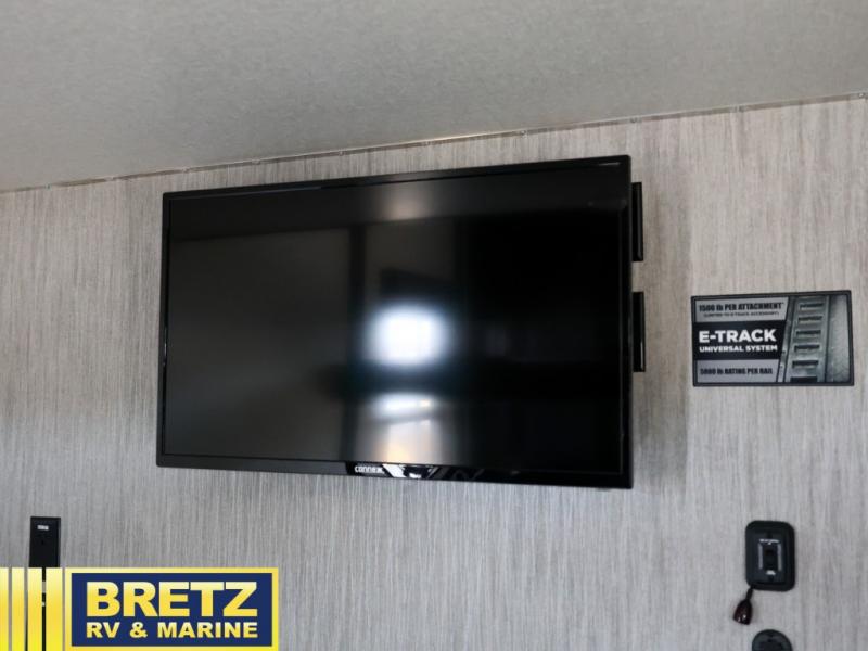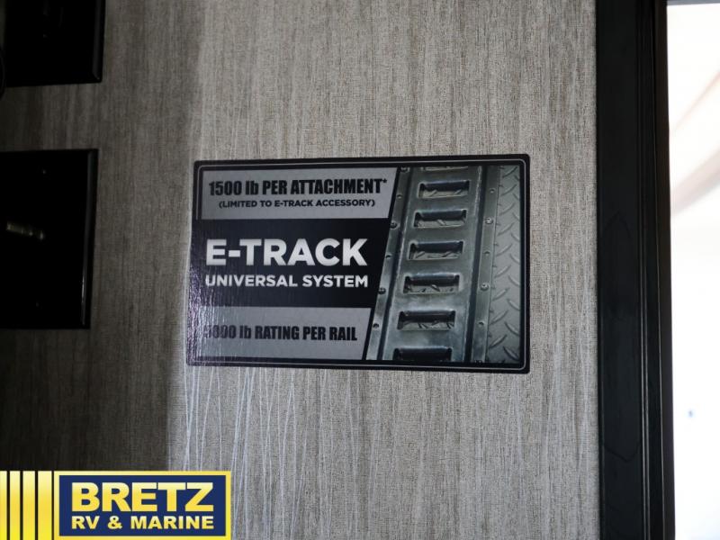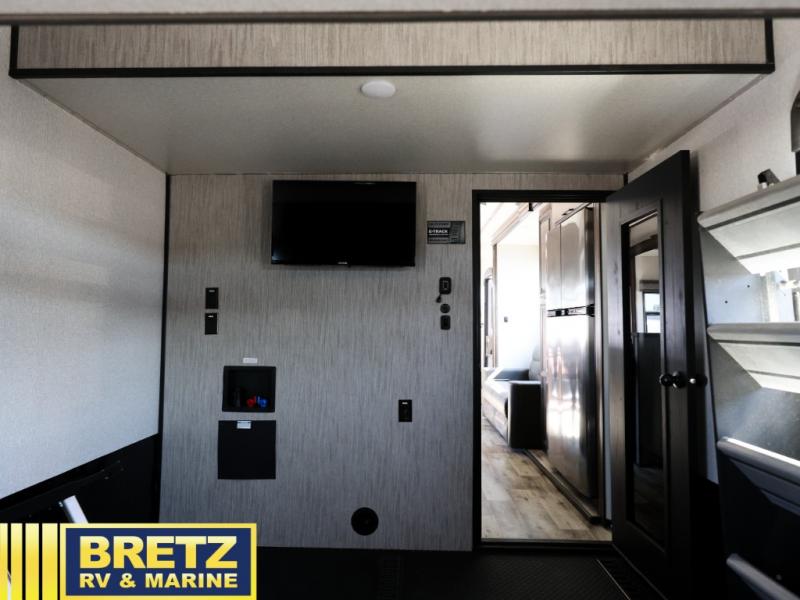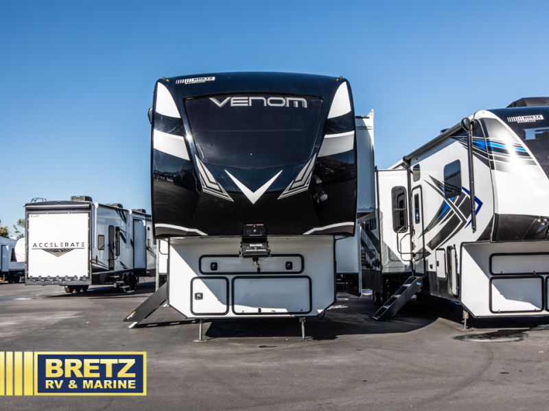 With any Venom toy hauler fifth wheel by KZ, you can be confident in the construction from the Tufflex roofing material that is flexible, reflective and puncture resistant, the extra reinforced heavy-duty front fiberglass cap, the double insulated and heated holding tanks, and the additional outside frame-to-wall floor insulation. The fully vented attic allows for unwanted moisture to escape easily, and each model includes the All Weather Insulation Package with a heated, insulated, and enclosed underbelly. Add that with the 40,000 BTU furnace and the three 15,000 BTU ducted roof A/C with Whisper Quiet cooling system, and you'll be camping all year around! The garage has been constructed with your adventures in mind with its E-Track tie-down system, built-in dovetail, and a Zero Gravity ramp door with easy-lift assist. Inside, you will enjoy residential carpet, luxury woven vinyl flooring in the slide outs, extra-large light switches, a residential one-piece fiberglass shower stall with glass doors and a built-in seat for convenience, a central vacuum system with attachments, and much much more! You can add options to customize your Venom such as the Xantrex 125AH Lithium battery with Bluetooth App controls, the "Off The Grid" solar package, the 2,000W Pure Sine Wave inverter, and/or the 7.0KW gas Onan generator, plus more!