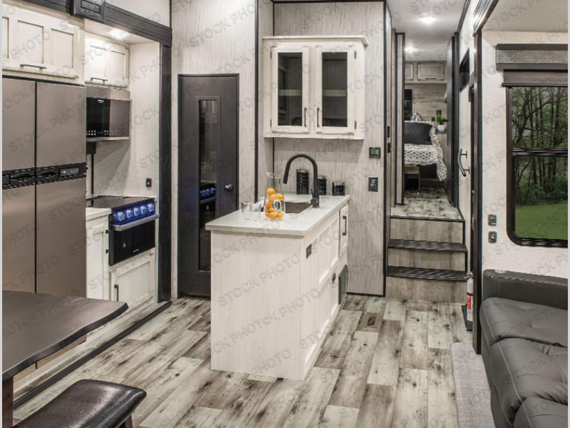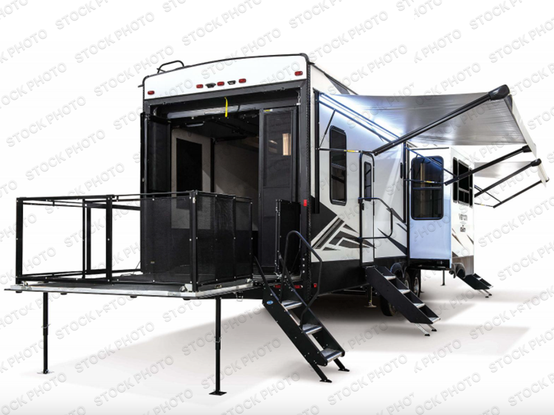 Spacious, luxurious and convenient are a few words you will be thinking each trip you take with this fifth wheel in tow! From the 15'9" separate garage to load up every toy you want, and the dual slides in the main living and kitchen area to the front master bedroom with a slide out wardrobe, there is lots of floor space. The garage also offers storage, access to the loft bed, plus the option to add a power bed with Sit and Sleep making this space a great area to relax after the rides. The 30 gallon fuel tank will keep the toys running, and the side man door is handy when you have the ramp cargo door closed. In the main living and kitchen area you can relax on the four-person super sofa with footrests, dine at the table with booth and chair seating, and watch the 43" Smart LED TV. The cook will love the counter peninsula to prepare and serve meals, and all the kitchen appliances in the slide out. Everyone can take turns getting cleaned up in the full bathroom, and you can retire to the master bedroom with a walk-around electric-tilt king bed or choose the queen option, and there is plenty of storage for your clothing plus a closet prepped for a washer/dryer option. You will find even more storage in the pass-through compartment along the exterior.