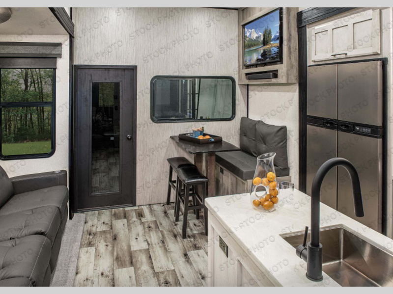 With any KZ Venom V-Series toy hauler fifth wheel, you will have 6-sided aluminum framing, a partial painted fiberglass front cap, and generator prep with a 30 gallon fuel tank and pump station to keep the fun going. More standout features include the six-point electric auto leveling, the Equa-Flex suspension, and Tufflex roofing material for a flexible, puncture resistance and reflective roof. The fully vented attic system provides two attic vents for escape routes for unwanted moisture, and the All-Weather Insulation package allows you to travel during any season. The interior provides deluxe residential-style furniture, decorative lighting above many cabinets, heavy-duty 100 lb. drawer glides on every drawer, and a On-Demand tankless water heater with digital user control panel. Make your selection today, and start having fun with your toys and enjoying the luxurious and comfortable features in any Venom V-Series!