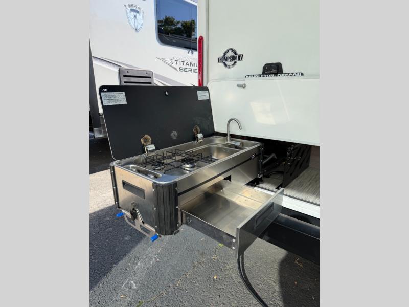 You can make this Lance travel trailer your sightseeing companion! Whatever location you want to see next, this trailer will keep you comfortable all along the way. The interior is stylish and modern with its solid-surface countertops, radius Euro overhead cabinet doors, and hardwood flat-panel cabinet doors, and the deluxe queen pillowtop innerspring mattress with two LED reading lights will be great to have each night for sleeping and reading your favorite book. Spend some time getting meals together on the three-burner range with 21" oven, or head outside to use the optional exterior kitchen to prepare all of your meals in the fresh air.