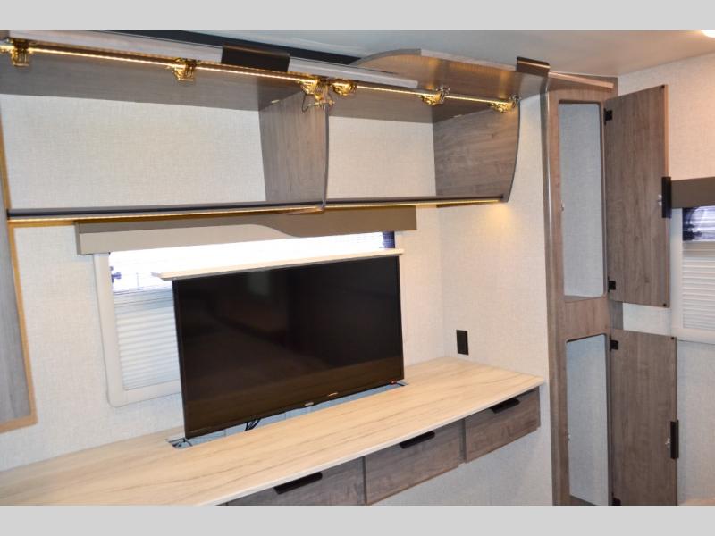 This Lance travel trailer has the best bedroom out of the entire brand! Not only do you have a private bedroom at the back of the trailer with a slide out for more walking space, but you also have a king-size bed just waiting for you to enjoy its comfort. Another comfortable feature found on this trailer is the front 42" x 72" sofa bed. Added to the booth dinette and king-size bed, this sofa helps this trailer sleep five people during every getaway. You'll also be quite excited to find two smart LCD TVs that you can use to watch movies, and you can even add an optional 40" smart LCD TV to the bedroom.
