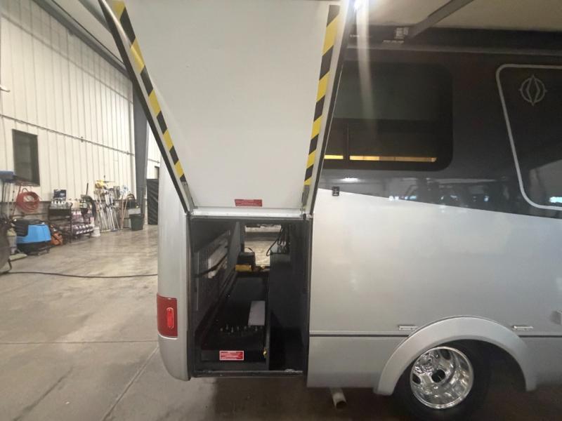 The adventurous type will love this coach with its large pass-through exterior garage-style storage with a bicycle/cargo slide that allows you to fit two full-sized bicycles and much more for fun outdoor adventures on the go. The separate rear bedroom provides convertible twin beds with easy access to the separate lavatory across from the enclosed shower, or you can make the twins into one 64" x 76" bed. The large galley offers a flip-down extension for more space for your drinks, dishes and such, a convection microwave oven, a flush mount LP cooktop with hinged glass cover, a garbage can to keep everything tidy, and a double door, three-way refrigerator, plus an accessory rail. This unit is also available with optional intelligent All-Wheel Drive (AWD).