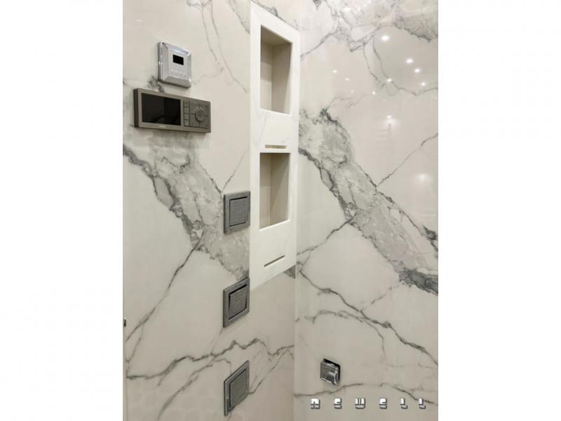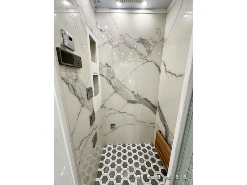 Cambria quartz countertops in master bathroomHeated polished tile flooring throughout