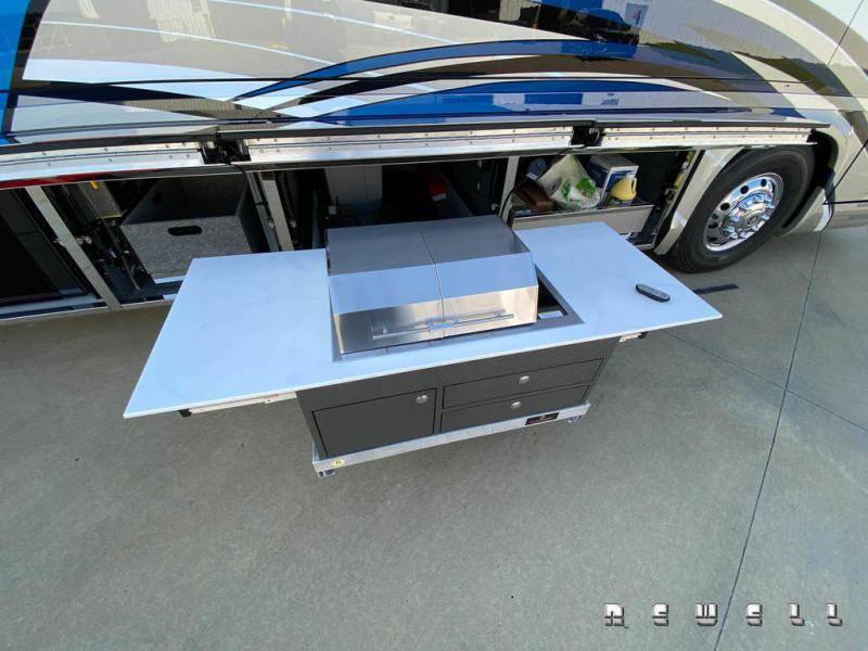 55-inch LG TV with premium soundbar on powered hinge in plumbing bayTexas Grill and kitchen cabinet with 2 drawers