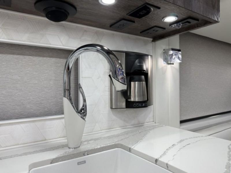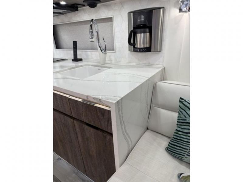 Expandable dinette with bench and two chairs and quartz topQuartz countertops with waterfall edge at galley