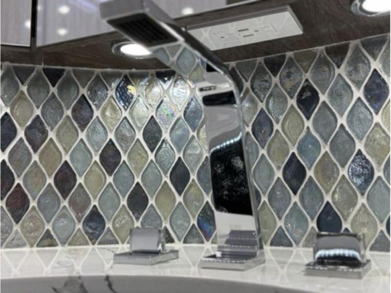 Quartz countertopsNatural stone shower walls and base