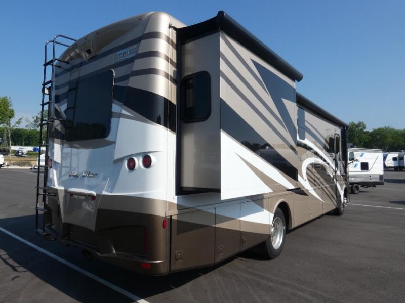 Each Bay Star Class A gas motorhome by Newmar delivers a smooth ride thanks to the standard electronic stability control, along with the 7.3-liter V8 engine with 450 HP and 468 lb./ft. of torque and heavy duty sway bars. The exterior is sure to turn heads with its full-paint Masterpiece Finish, and you'll have three interior decor choices and three wood choices to truly make the coach your own. Each model includes newly styled Williamsburg furniture, luxurious vinyl tile flooring, polished solid surface countertops in the kitchen, plus many more comforts. Head outside to find lit basement storage, a 5.5kW Onan generator with remote switch, and smart level hydraulic leveling jacks with a Bluetooth compatible touch pad for set up easy as 1-2-3!