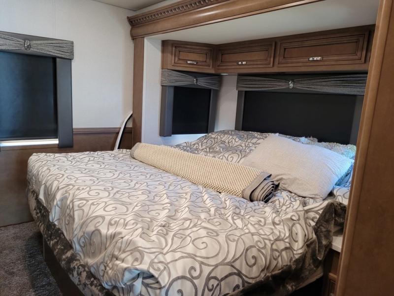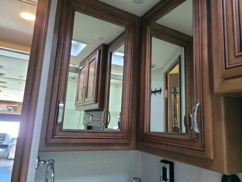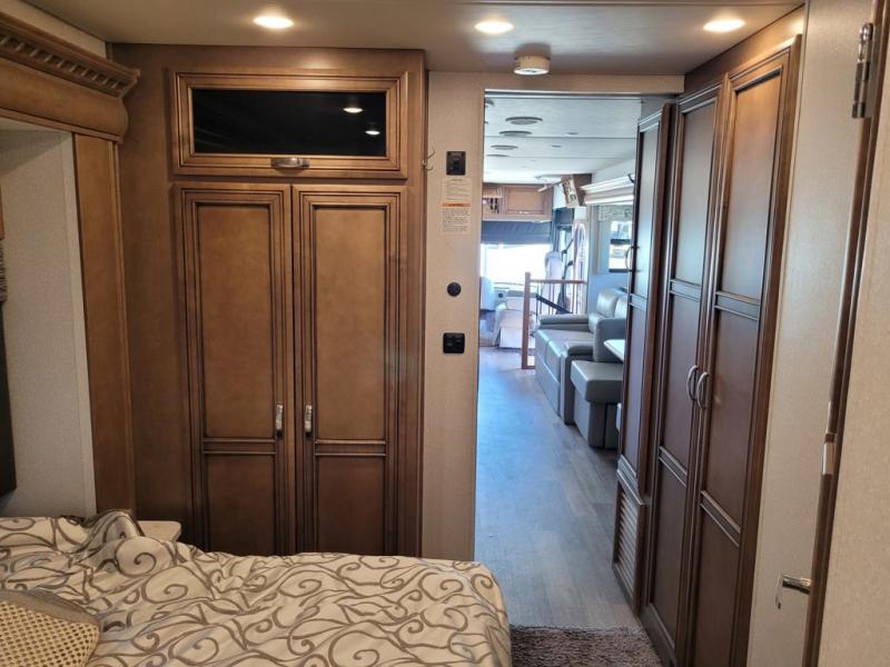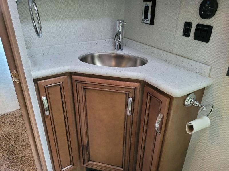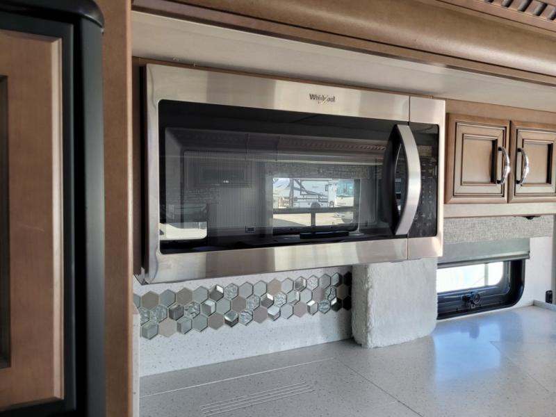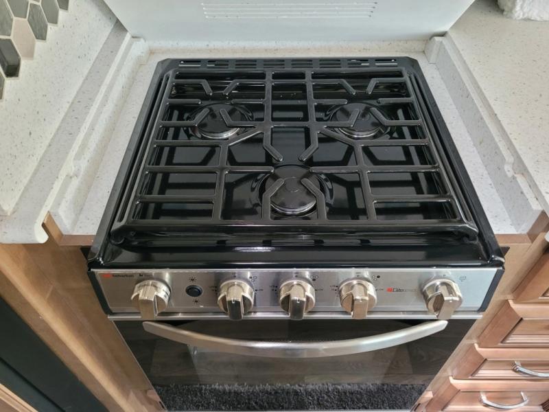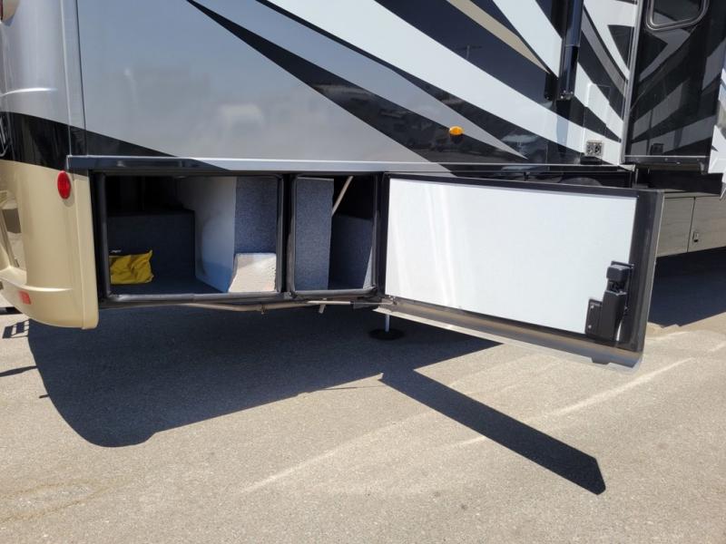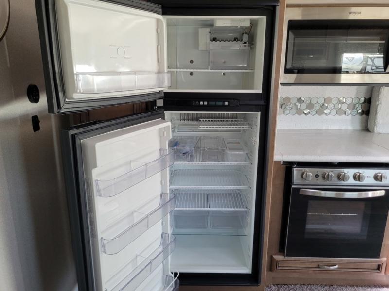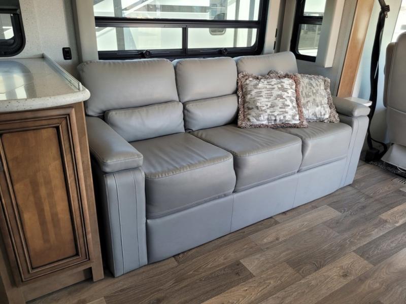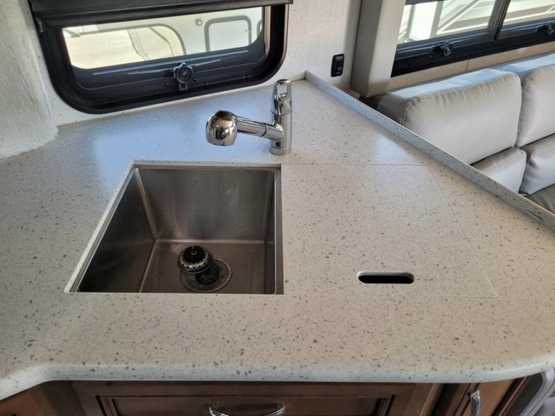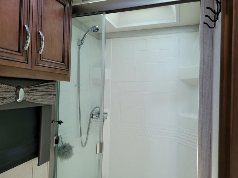 This motorhome with dual opposing slides in the main living area will provide your crew with tons of space to relax. You'll also find a slide out in the private bedroom suite, along with a king bed, a Samsung LED TV, and a shelf to store books or jewelry. There is a comfort lounge sofa, a booth dinette, and a tri-fold sofa in the main living area that will be perfect for guests, and the Samsung TV on power lift will allow you to enjoy movie night. In the morning, prepare breakfast on the recessed three burner cooktop before heading out for the day, and the full bath will allow you to clean up after a day outdoors!