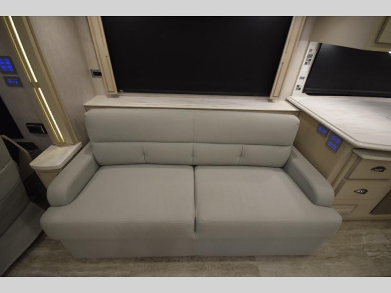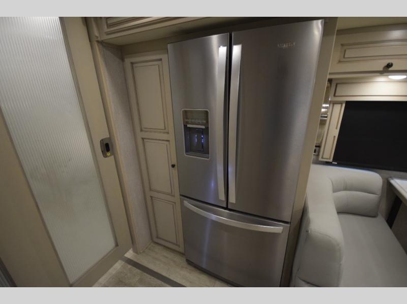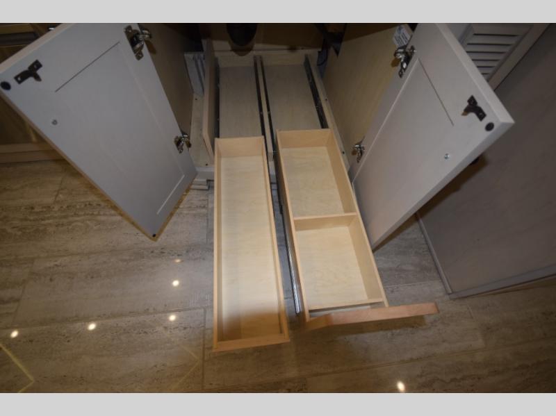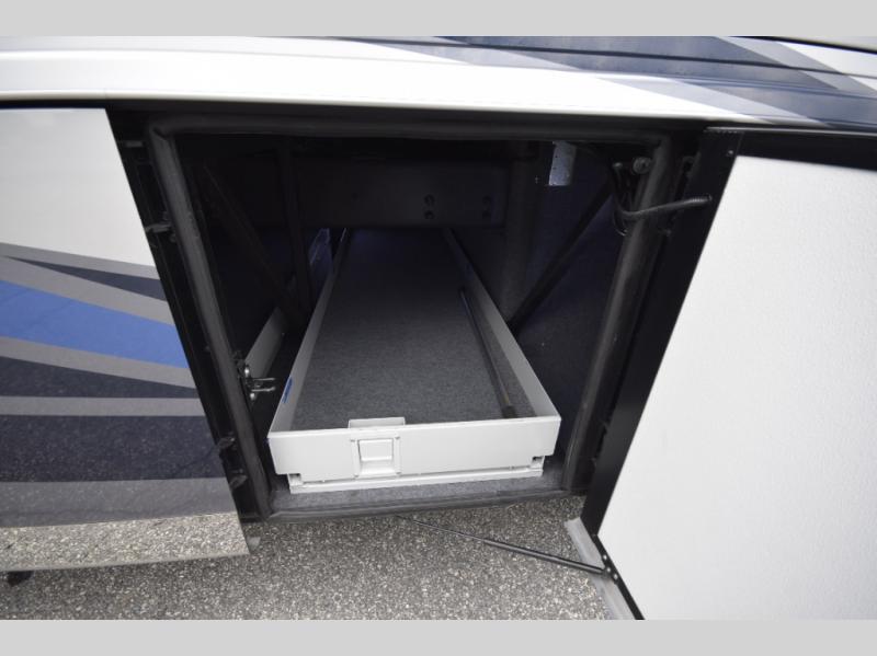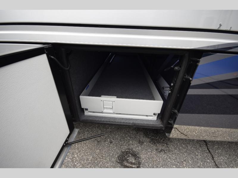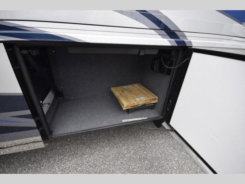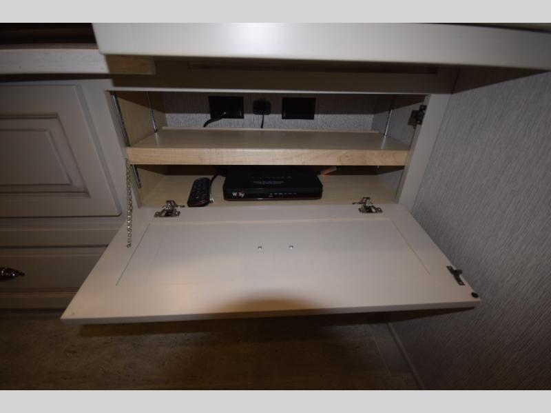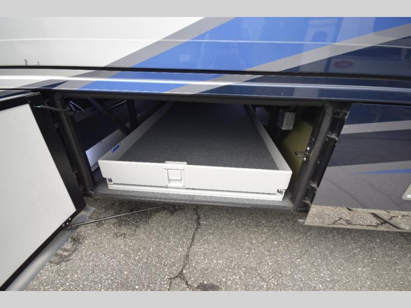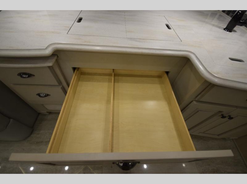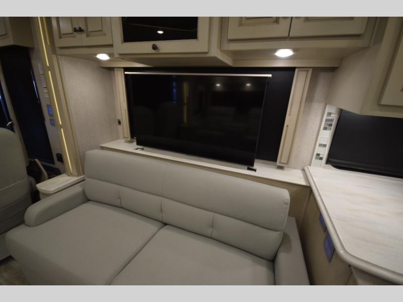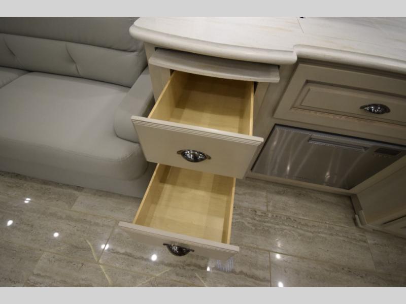The full-wall slide, paired with two additional slide-outs, dramatically expands your living space—creating an interior that feels more like a luxury condo on wheels. Entertain guests, relax in style, or work remotely with ease from the passenger workstation or hide-a-leaf dinette.